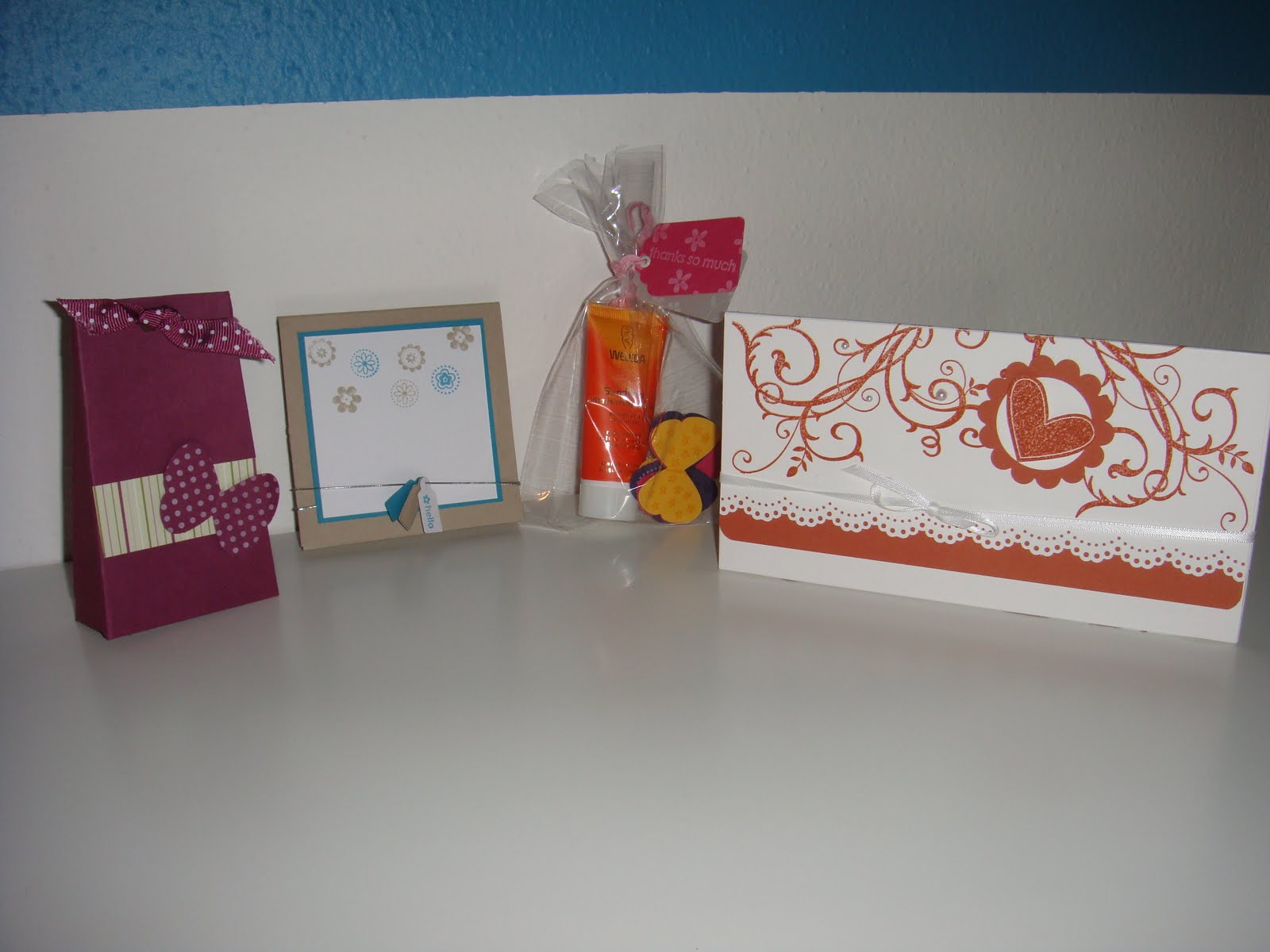 Eine superschöne Verpackung mit tollem Inhalt von Ela, einen Post-it-Block in supersüßer Verpackung von Tina, Handcreme und Stanzteile in total schönen Farben von Marion und eine Schoki-Verpackung (dreimal dürft Ihr raten, ob die Schoki noch drin ist…) von Annemarie.