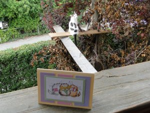 Fotografiert hab ich auf dem Balkon und dabei ist auch dieses Bild entstanden, dass ich Euch dazu zeigen möchte. Unser kleiner Cookie im Hintergrund. Ist er nicht goldig? Und paßt perfekt zu der Karte 🙂