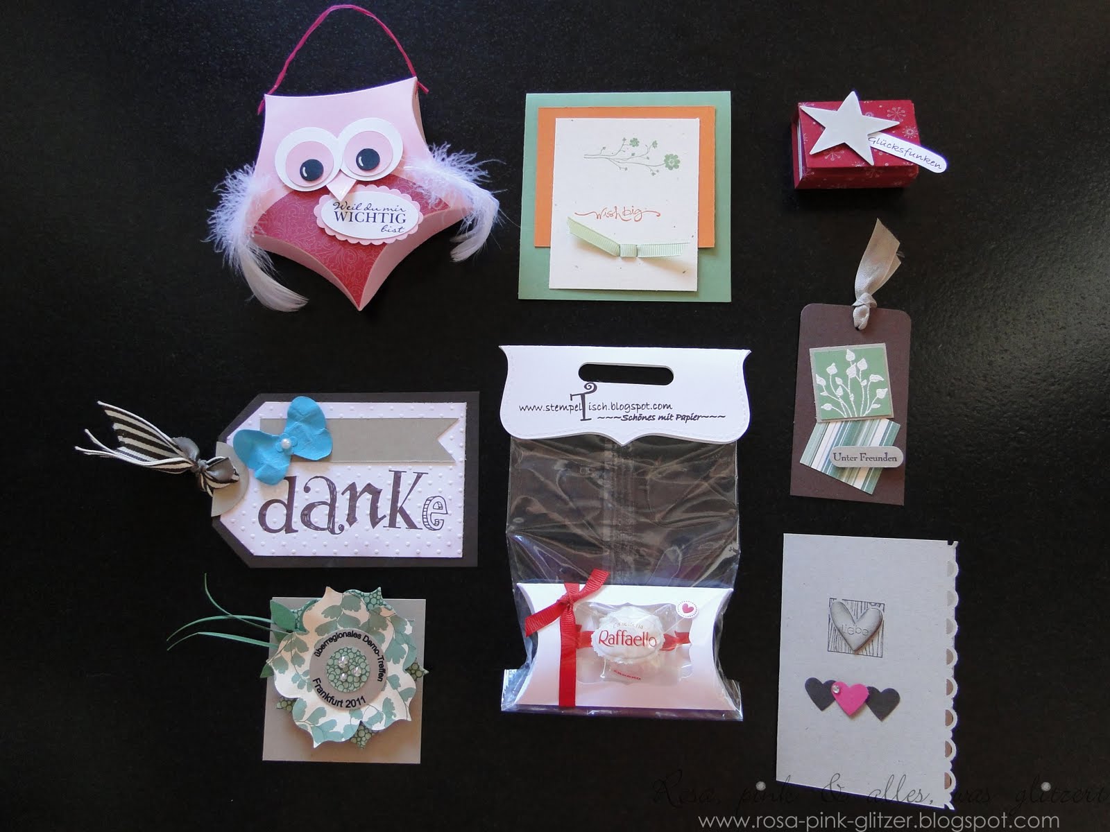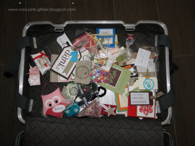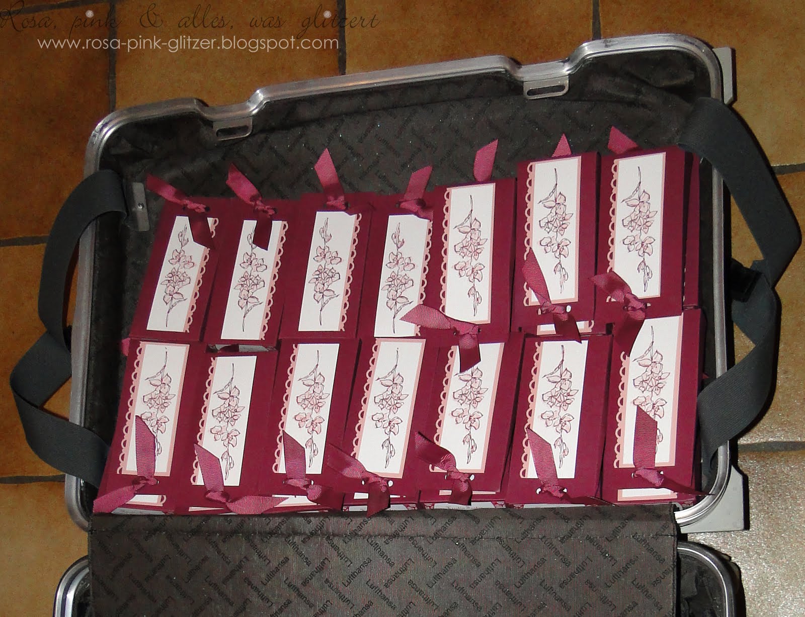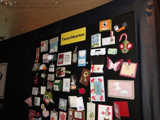 Im Hotel hab ich Christine getroffen und wir machten uns gemeinsam auf, den richtigen Raum zu finden. Einige Demos waren schon da und es wurde fleißig getauscht. Da stürzten wir uns gleich mit ins Getümmel und ich muss sagen, nächstes Mal mach ich mehr Swaps. Aufgrund unseres Umbaus und meiner doch sehr eingeschränkten Bastelsituation (in der Küche!) hab ich nur 30 Stück gemacht. Ein paar der lieben Demos haben mir auch ihre Werke gegeben, obwohl ich keins mehr zum tauschen hatte. Ich bedanke mich hier nochmal ganz herzlich dafür und auch bei allen, die mit mir getauscht haben. Bei mir gibt es übrigens auch zwei Versionen, die sich aber nur unwesentlich voneinander unterscheiden. Mir ging nämlich zwischendurch der Cardstock in Kirschblüte aus und nachdem ich ein Unter-Druck-Fertigsteller bin, war auch keine Zeit mehr, welchen zu bestellen.
