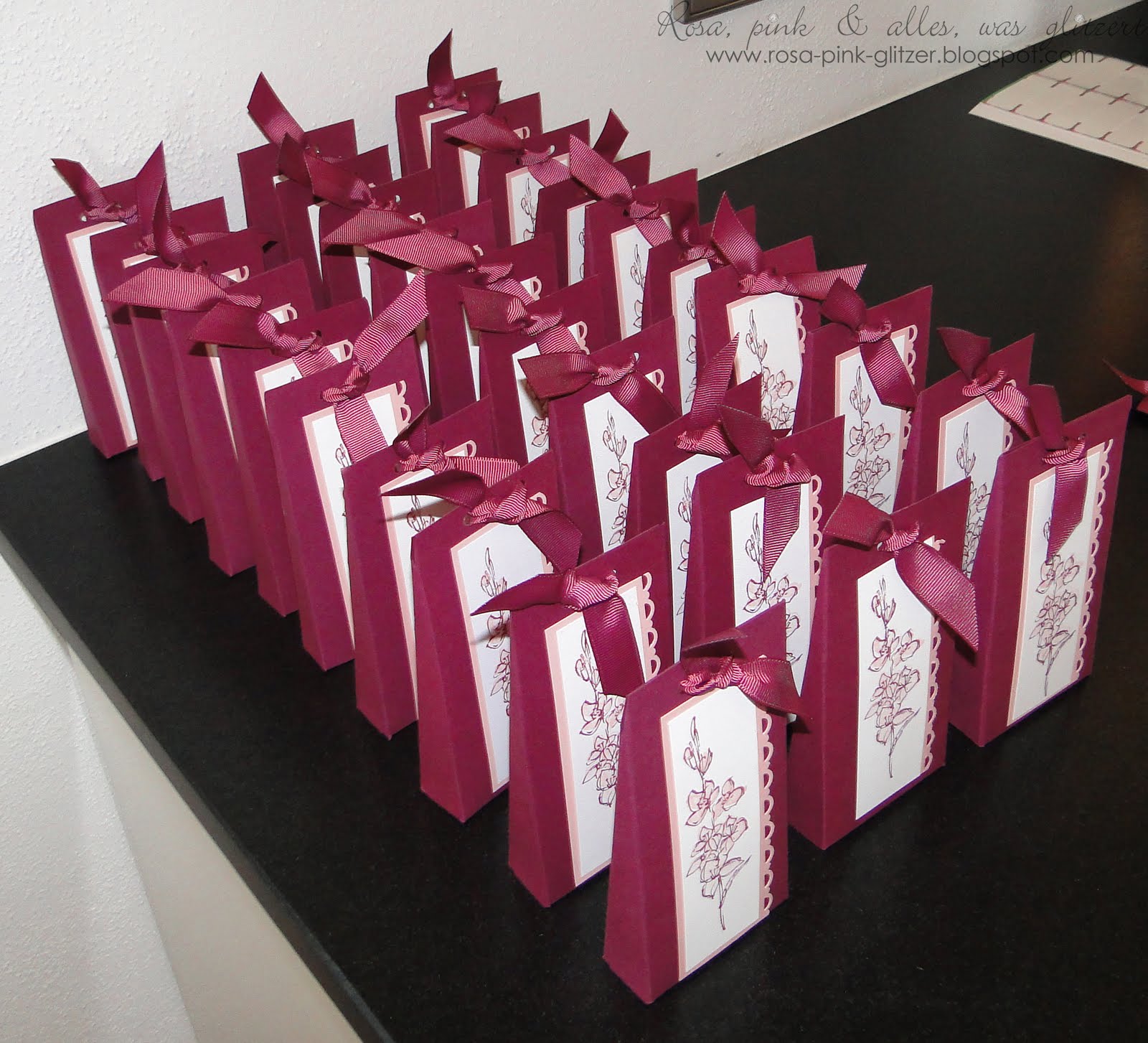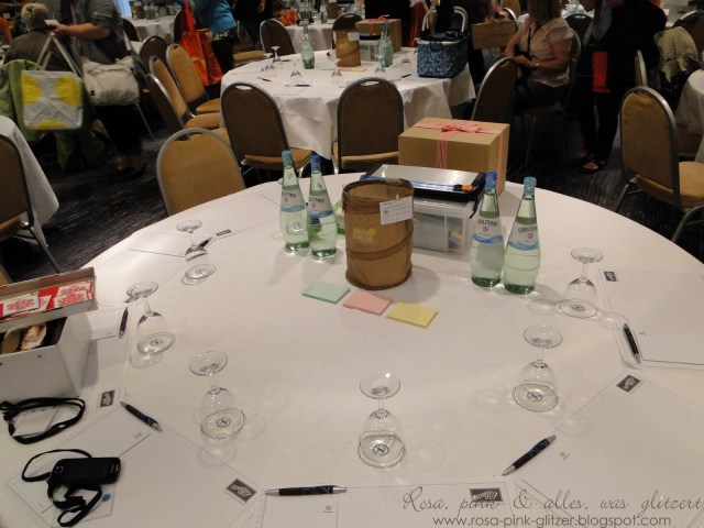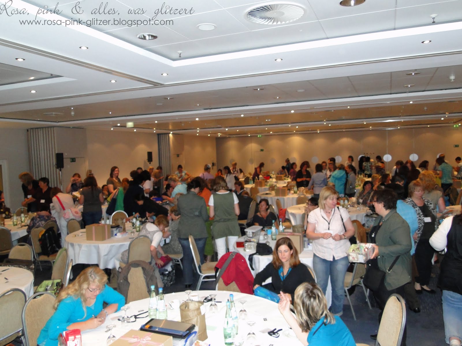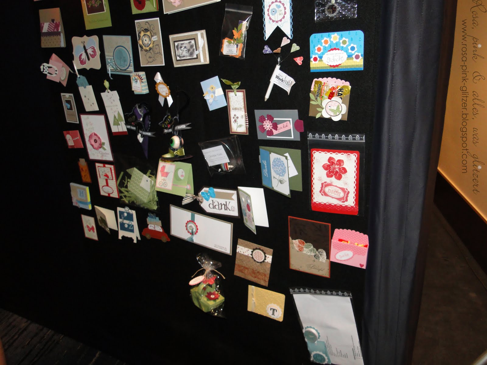 Im Hotel hab ich Christine getroffen und wir machten uns gemeinsam auf, den richtigen Raum zu finden. Einige Demos waren schon da und es wurde fleißig getauscht. Da stürzten wir uns gleich mit ins Getümmel und ich muss sagen, nächstes Mal mach ich mehr Swaps. Aufgrund unseres Umbaus und meiner doch sehr eingeschränkten Bastelsituation (in der Küche!) hab ich nur 30 Stück gemacht. Ein paar der lieben Demos haben mir auch ihre Werke gegeben, obwohl ich keins mehr zum tauschen hatte. Ich bedanke mich hier nochmal ganz herzlich dafür und auch bei allen, die mit mir getauscht haben. Bei mir gibt es übrigens auch zwei Versionen, die sich aber nur unwesentlich voneinander unterscheiden. Mir ging nämlich zwischendurch der Cardstock in Kirschblüte aus und nachdem ich ein Unter-Druck-Fertigsteller bin, war auch keine Zeit mehr, welchen zu bestellen.
