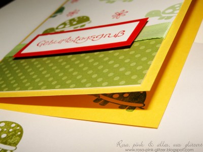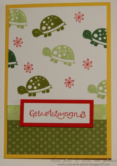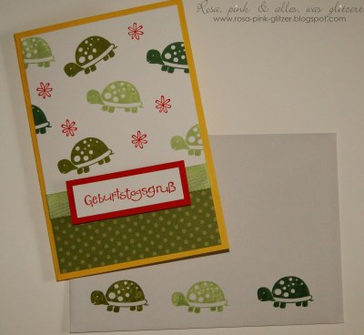 Letztens hatte meine Schwester einen eiligen Auftrag für mich, der am besten schon gestern hätte fertig  sein sollen. Denn sie hatte den Geburtstag einer Mitarbeiterin vergessen. Für einen verspäteten Geburtstagsgruß ist eine Schildkröte doch immer ein gutes Motiv. So entstand diese Karte.
