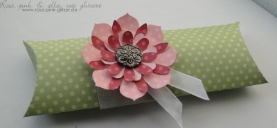 Heute gibts bei In{k}spire_me eine tolle Farbkombi von Tina. Richtig schön frühlingsmäßig, oder? Bin gespannt, was Euch dazu einfällt. Ich hab daraus eine frühlingshafte Verpackung gewerkelt und dabei gleich meine neue BigShot-Stanzform „Blüten“ aus dem Mini-Katalog eingesetzt.