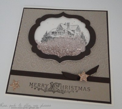 Für die Inkspiration-Weeks hab ich mich an eine neue Kartenform gewagt und zwar an eine Shaker-Karte. Vielleicht denkt Ihr gerade „Ah ja, Shaker-Card – ähm, was ist so besonders daran???“. Das besondere ist, dass Ihr die Karte schütteln könnt und dann einen Effekt wie in einer Schneekugel habt. Bei mir schneit es wunderhübschen Glasglitter in Champagner. Ein Video würde alles besser zeigen. Ich habs aber probiert und muss sagen: Ich hätte keine Karriere hinter der Kamera gemacht. Der Effekt kommt bei meinen Aufnahmen einfach nicht so toll raus. Also hab ich es wieder mit „stehenden“ Bilder versucht: