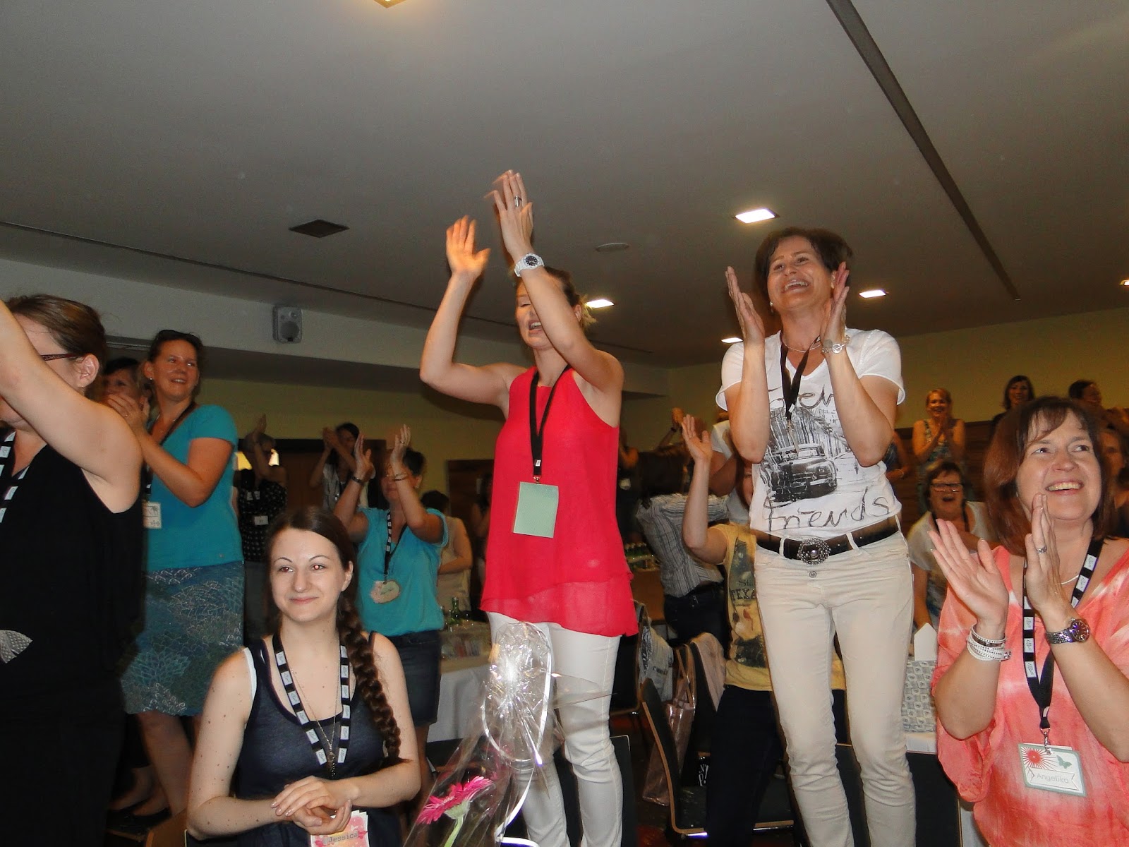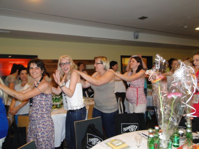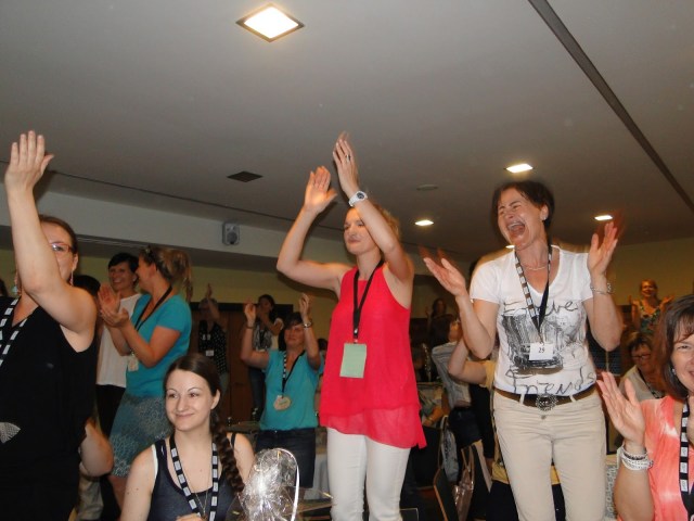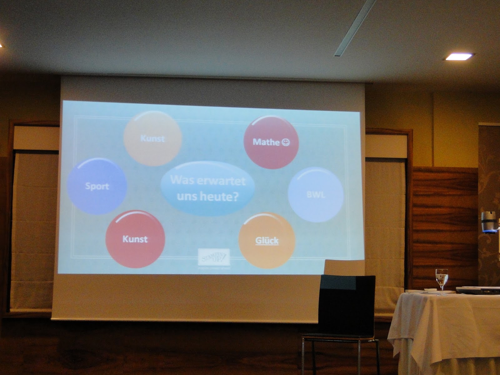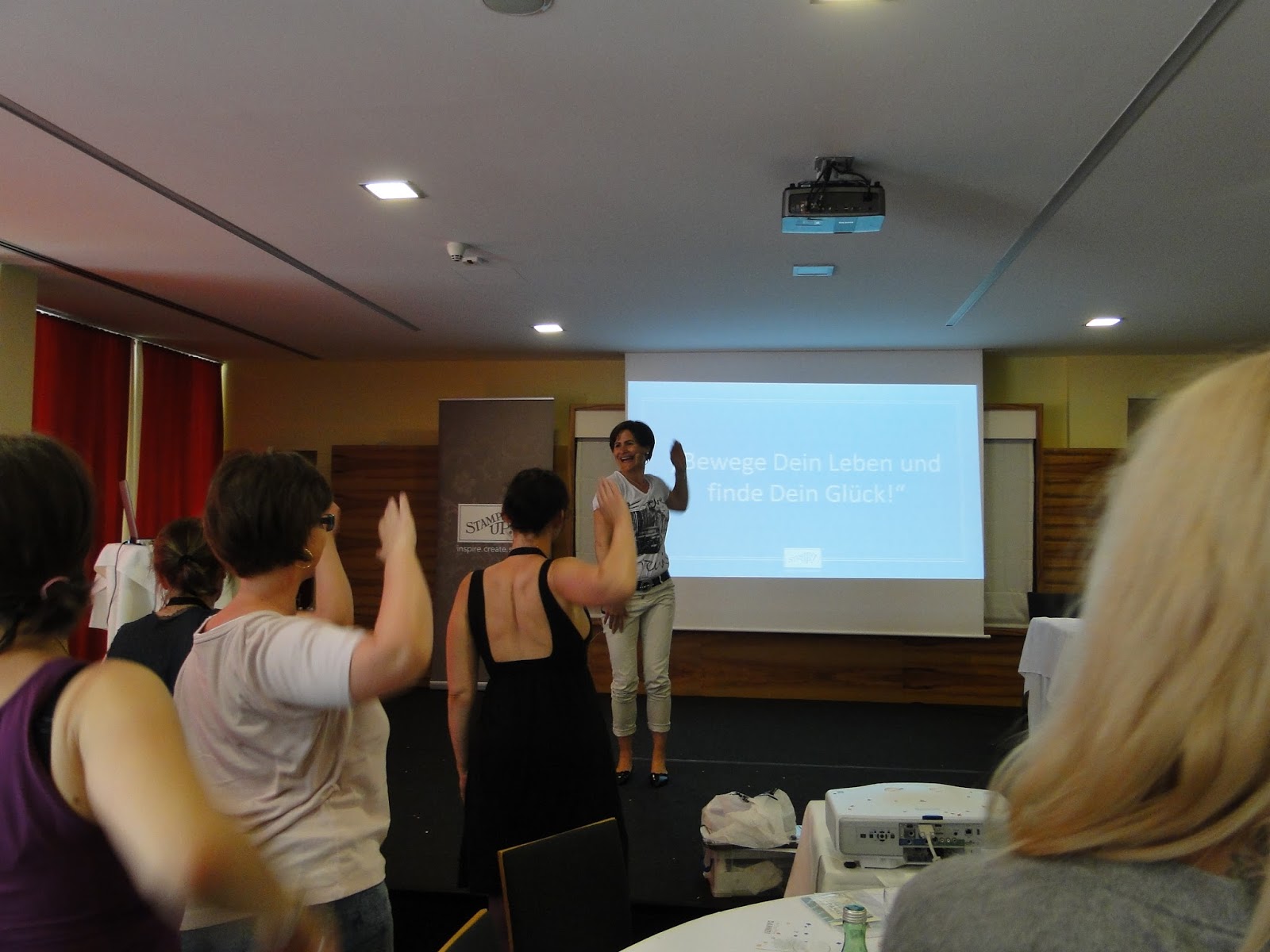 Michaela hat uns dann mit ein wenig Sport aus dem Mittagstief geholt. Eine Meisterleistung bei gefühlten 35 Grad im Raum. Aber wer so mitreißend vorturnt, verdient es auch, dass man fleißig mitmacht.