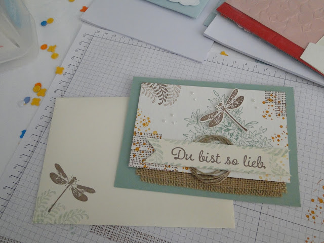 Und hier ist mein kreativer Output dieses Samstags: Eine Karte mit dem neuen Stampin‘ Up! Stempelset „Awesomely Artistic“ in Minzmakrone, Taupe und Ockergelb: