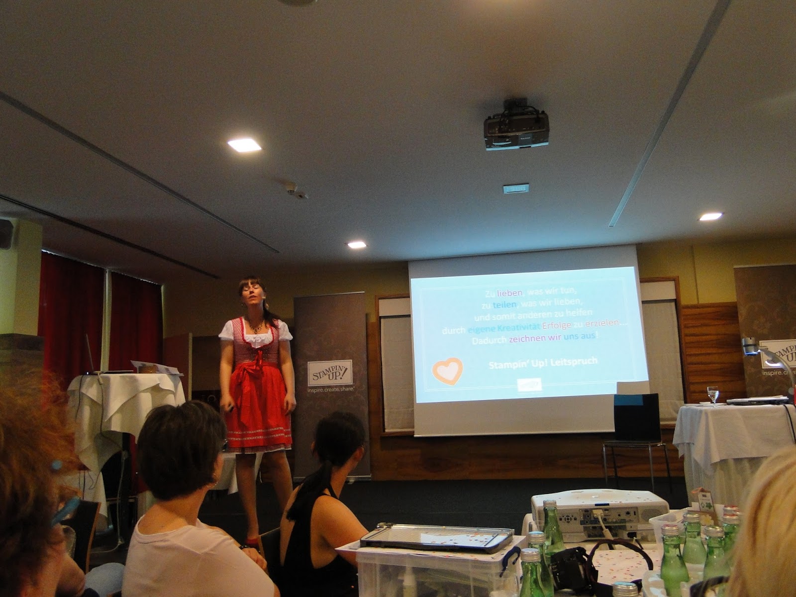 Die Stampin‘ Up! Damen hatten sich ordentlich in Schale bzw. Tracht geworfen, um dem Veranstaltungsort Tribut zu zollen. Ok, man merkte z. B. am Schmuck schon, dass sie noch nicht richtig reingewachsen sind in die österreichisch-bayerische Tradition. Aber es sind sehr gut Ansätze vorhanden 😉