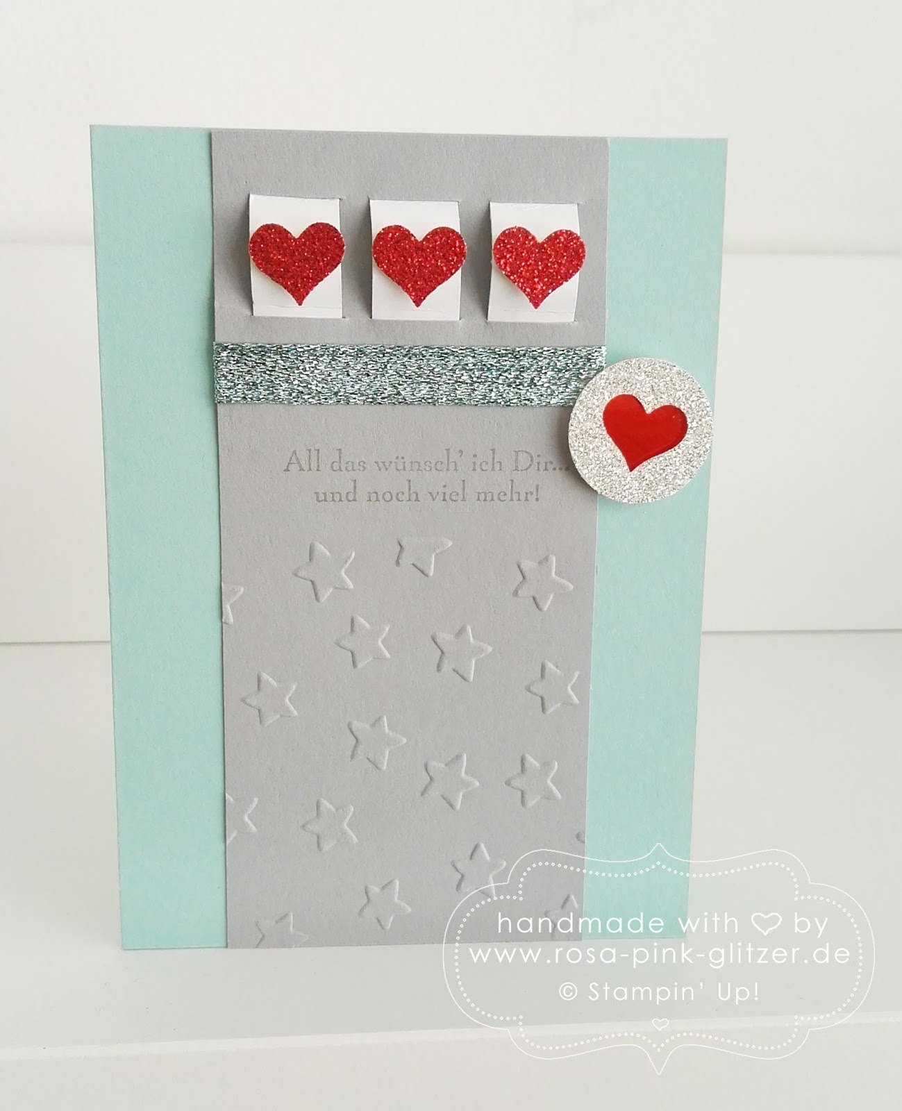 Das Herzchen ist aus Glitzerpapier in Silber ausgestanzt und mit rotem Glanzpapier hinterlegt.
