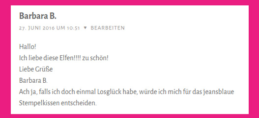 Liebe Barbara, offenbat gab es eine kleine Elfe, die Dir doch ein wenig Losglück beschert hat 😉 Schreib mir doch Deine Adresse, damit sich das Stempelkissen in Jeansblau bald auf den Weg zu Dir machen kann!