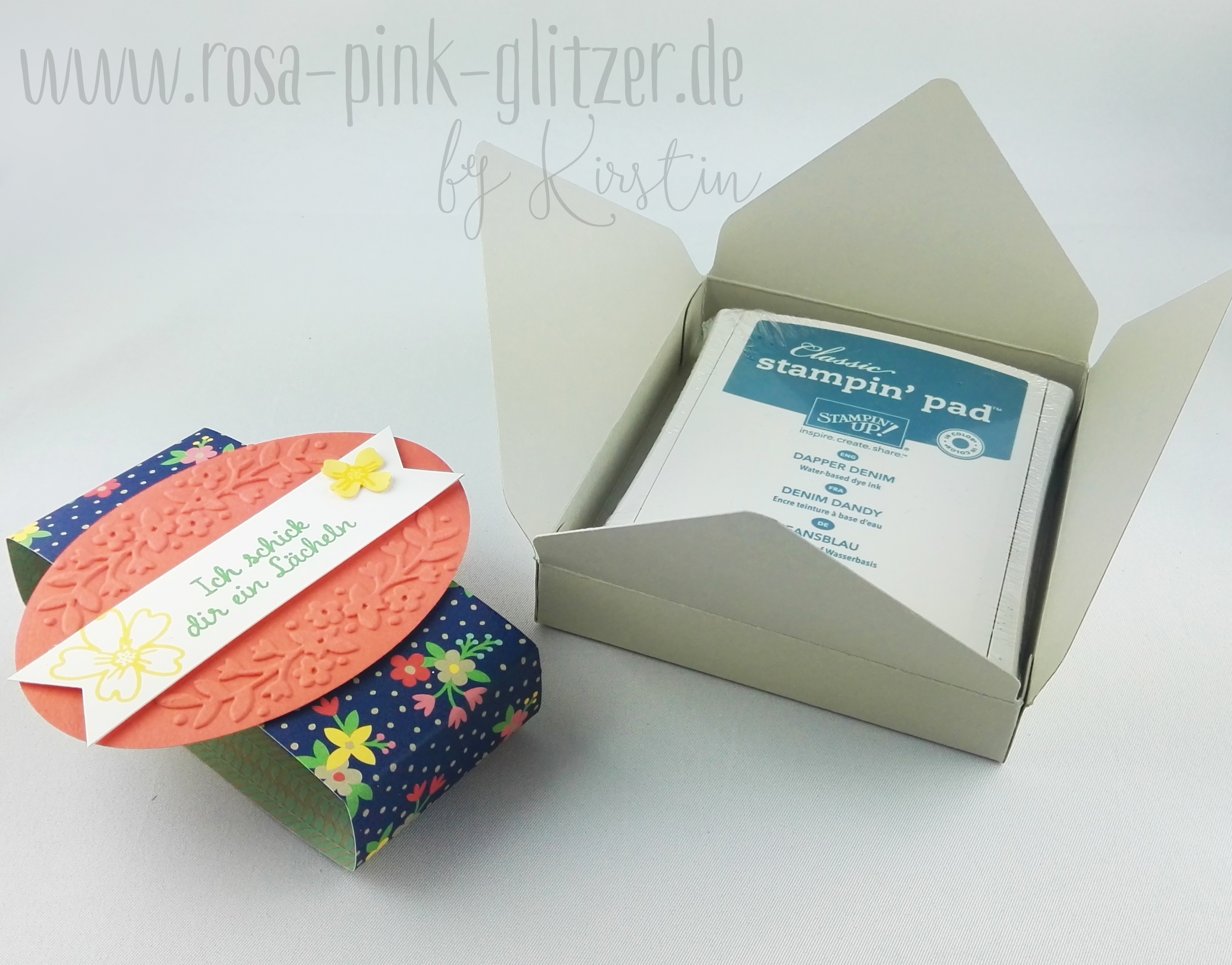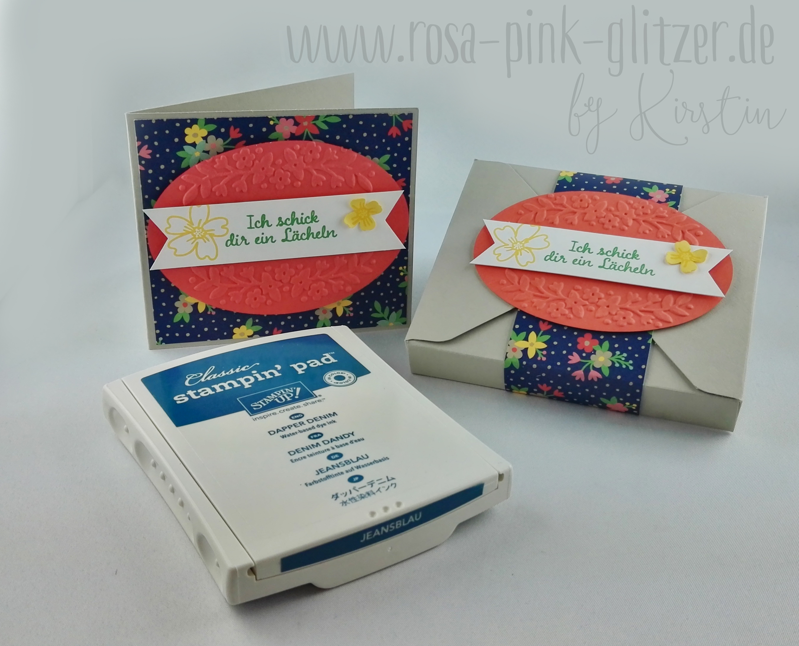 Dieser hübsche Spruch stammt aus dem Stampin‘ Up! Stempelset „Für Lieblingsmenschen“. Ich fand ihn genau passend für einen kleinen Gewinn. Könnt Ihr Euch noch an die Inkspiration-Weeks erinnern? Dabei hatte Barbara bei mir ein Stempelkissen in ihrer Wunschfarbe Jeansblau gewonnen. Und so sah das dann aus: