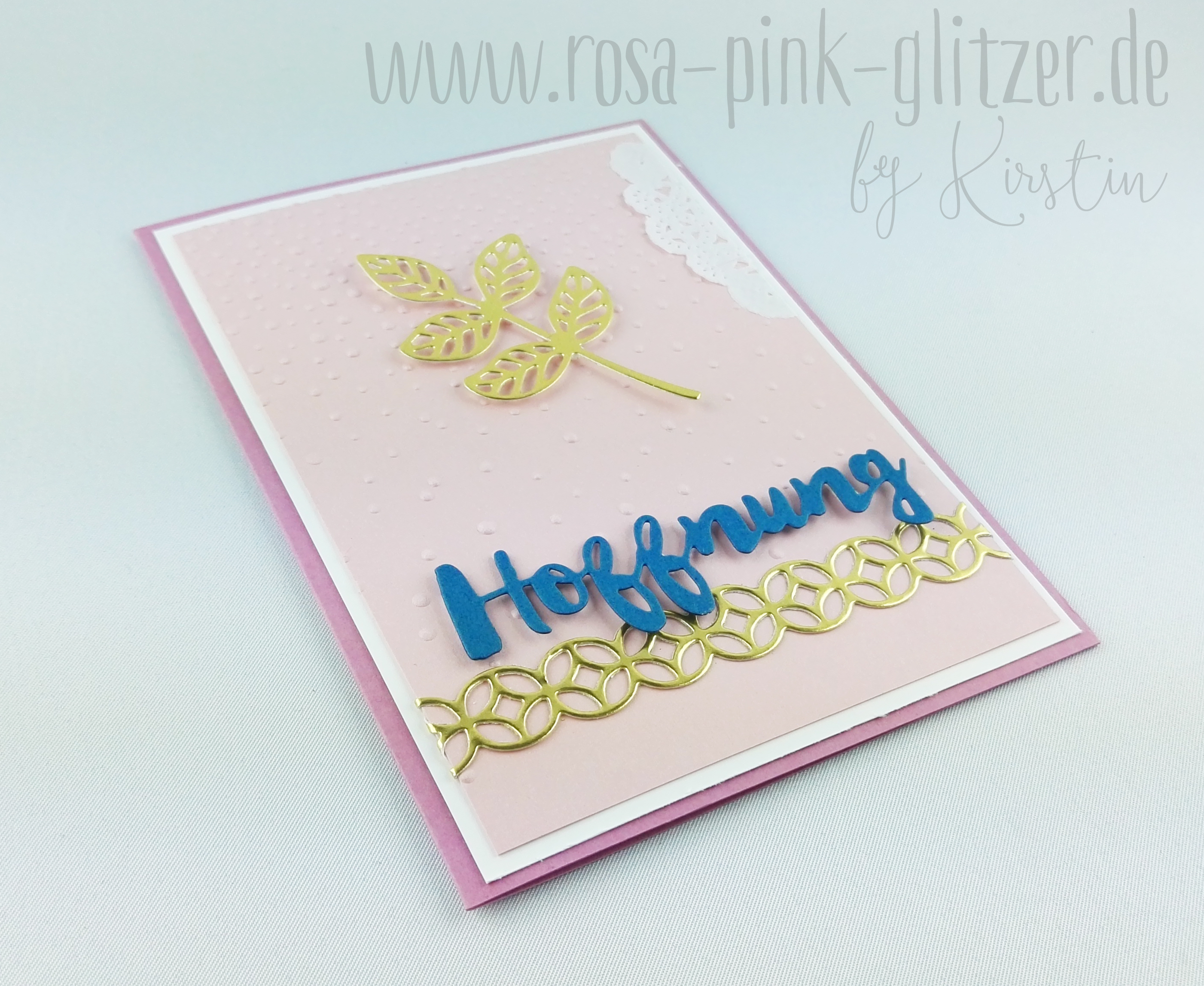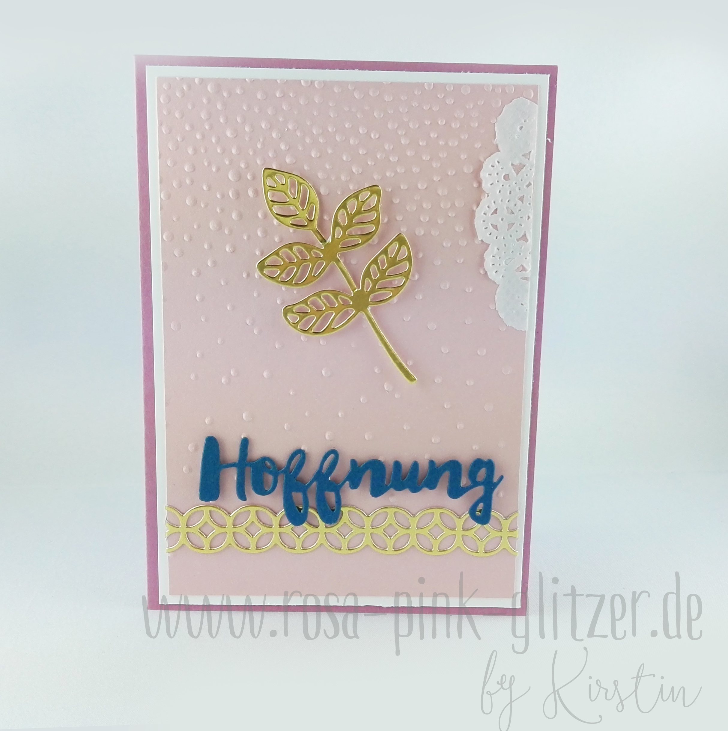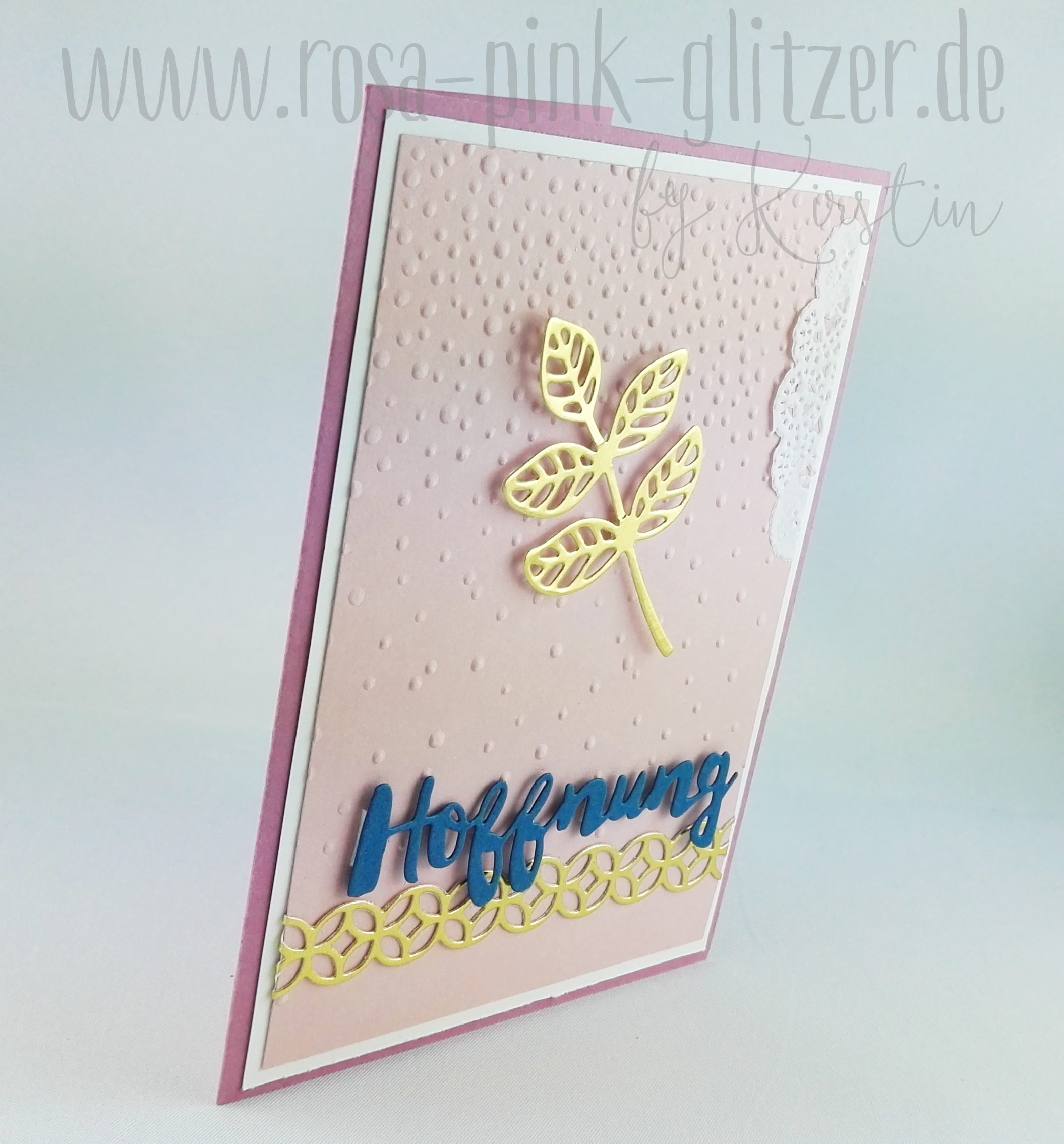 Aber erstmal zeig ich Euch diese Karte hier: Irgendwie ist sie fast ein wenig spirituell oder so geworden, oder? Liegt wohl an dem Wort Hoffnung in Verbindung mit dem hübschen Blatt aus den Thinlits Blütenpoesie.
