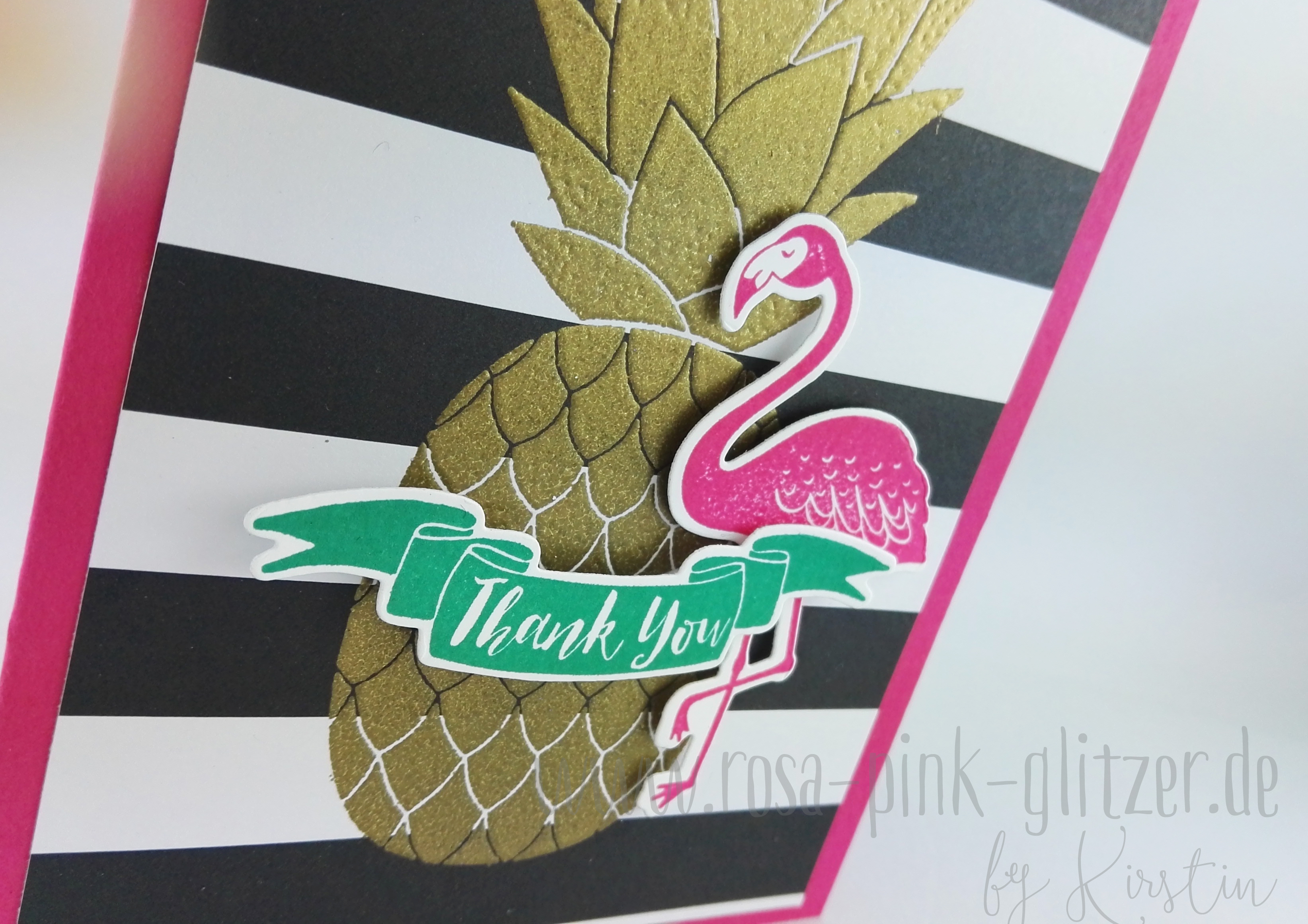 Als kleines Kontrastprogramm zu dem ganzen Weihnachtskram gibt es heute mal wieder den Flamingo aus „Pop of Paradise“ von Stampin Up. Er passt ganz hervorragend zum Einzelstempel „Pinapple“ wie ich finde. Diesen habe ich in Gold embosst, auf dem Besonderen Designerpapier Pink of Pop.