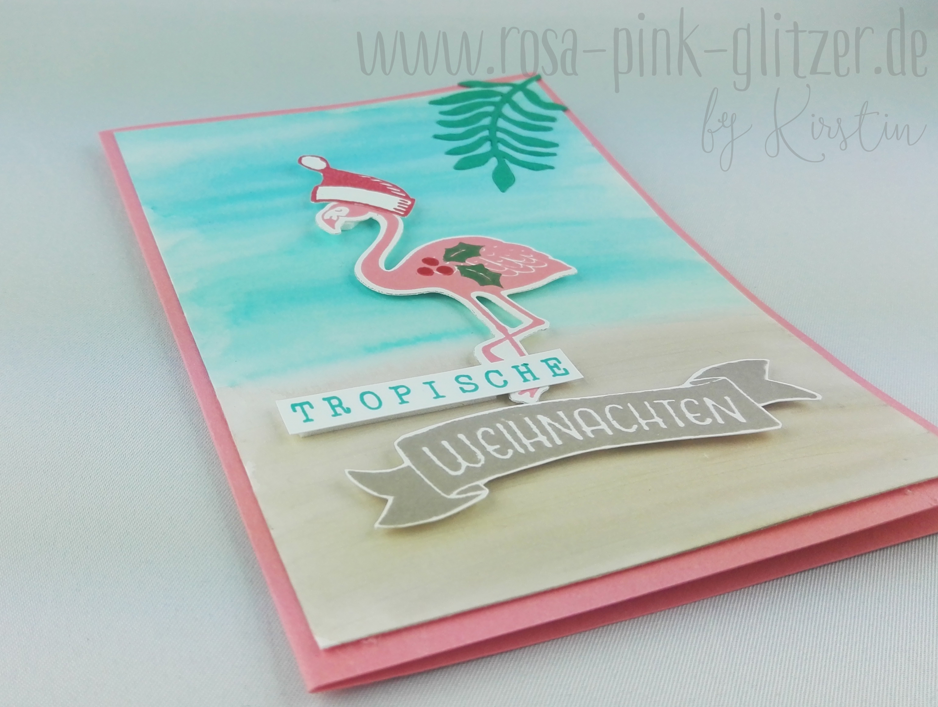 Ich freu mich wahnsinnig über dieses Thema. Irgendwie geisterte die Idee einer tropischen Weihnachtskarte schon länger in meinem Kopf umher. Irgendwie erschien es mir aber doch ein wenig zu abgedreht. Aber irgendwie dann wieder doch nicht . Und was soll ich sagen – hier ist mein Werk: