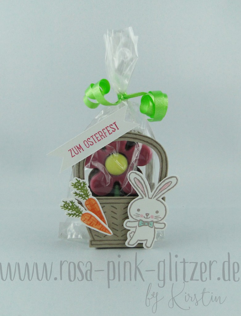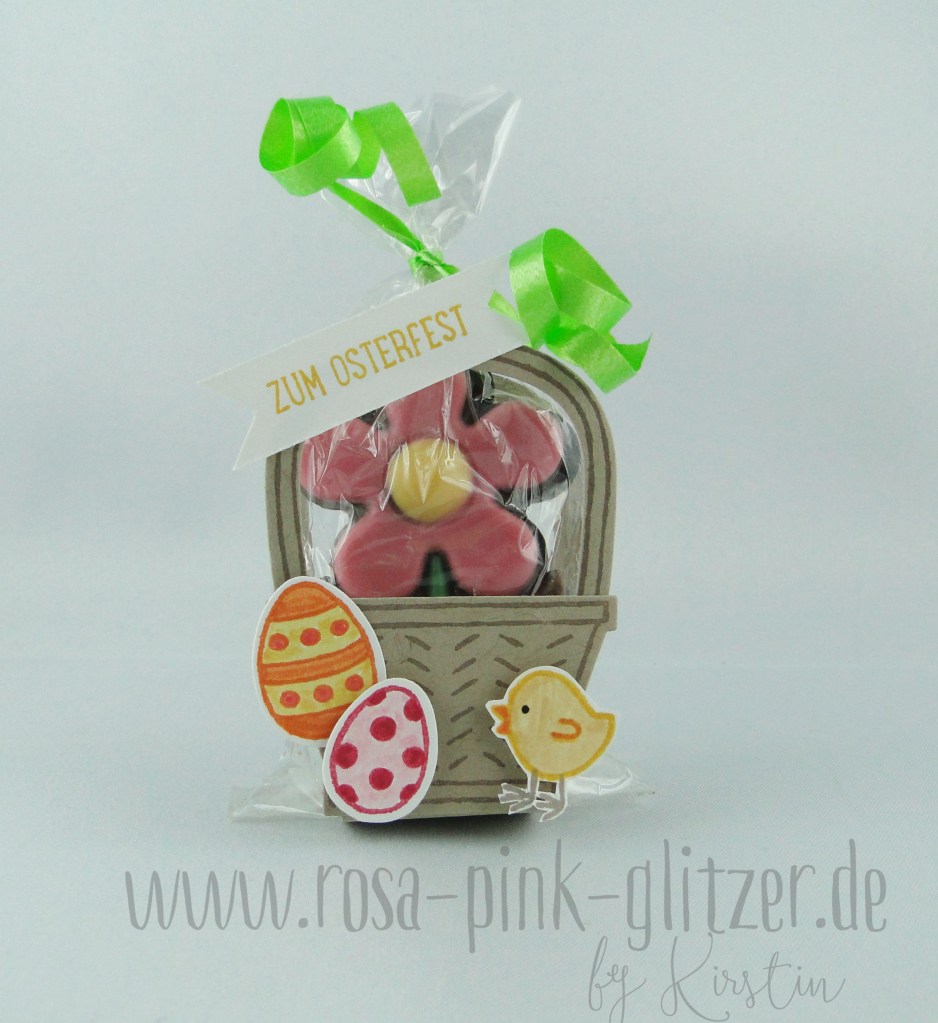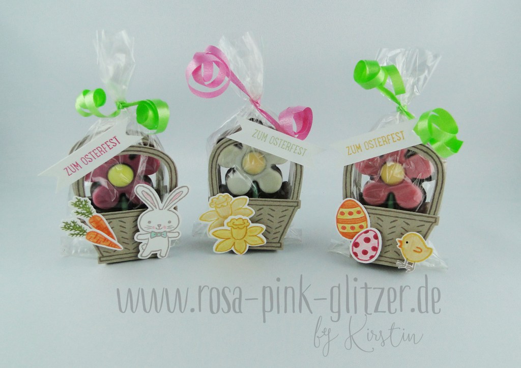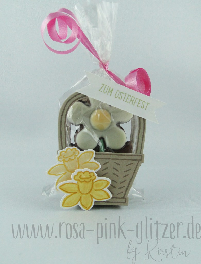 Ich hab kleine Körbchen für Euch, gefüllt mit einer hübschen Schokoladenblume. Das Stemplset Osterkörbchen von Stampin up ist einfach der Knaller! Damit kann man so schnell was hübsches zaubern.