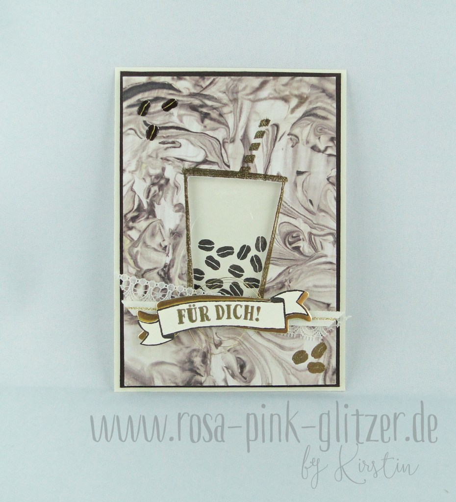 Heute hab ich wieder ein Projekt mit dem Stempelset „Kaffee, ole“ aus dem neuen Stampin up Jahreskatalog für Euch. Ich hab dafür mal die Rasierschaumtechnik ausprobiert. Puh, was für eine Sauerei! Aber der Effekt gefällt mir. Passt doch total gut zum Kaffee, oder?
