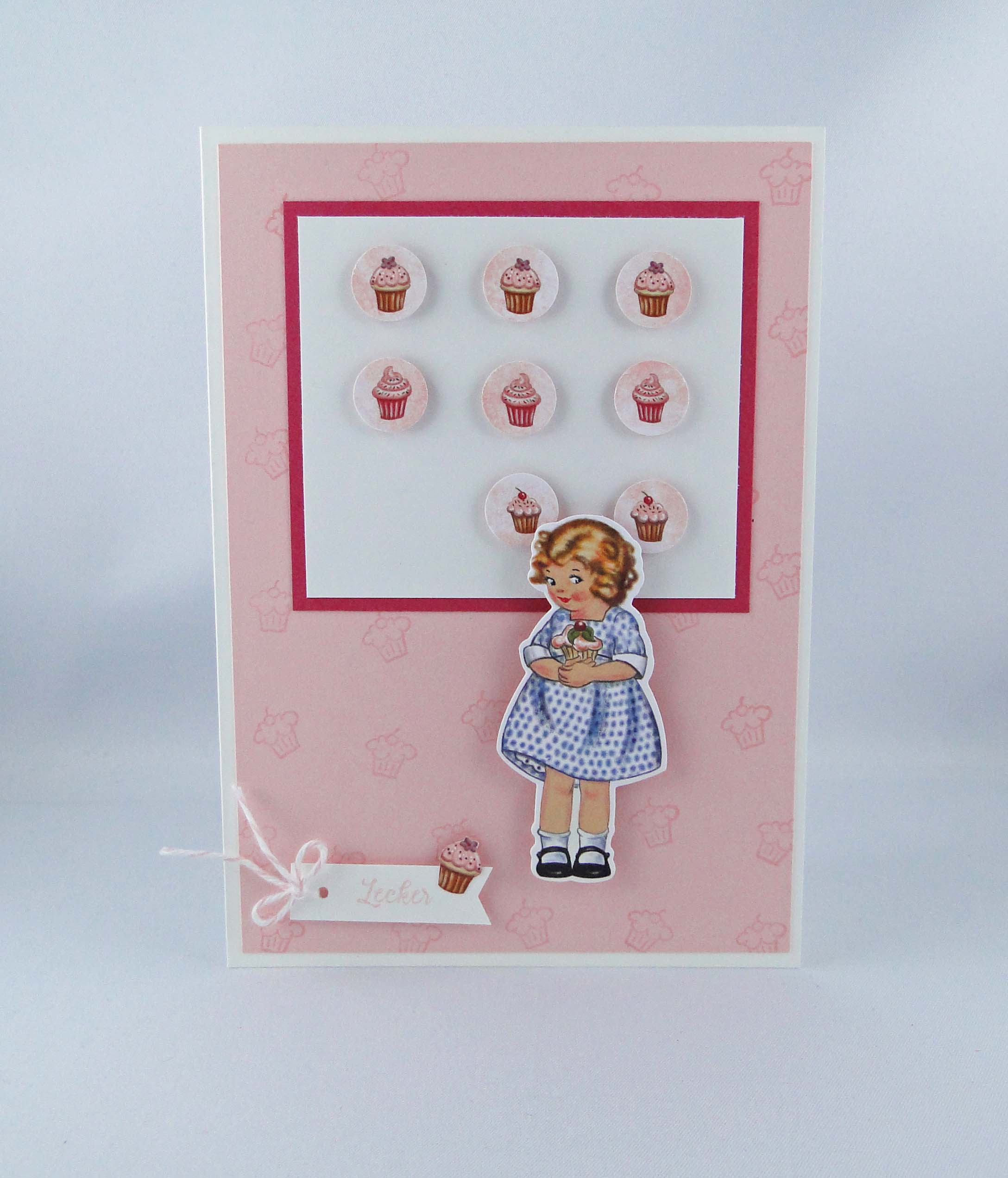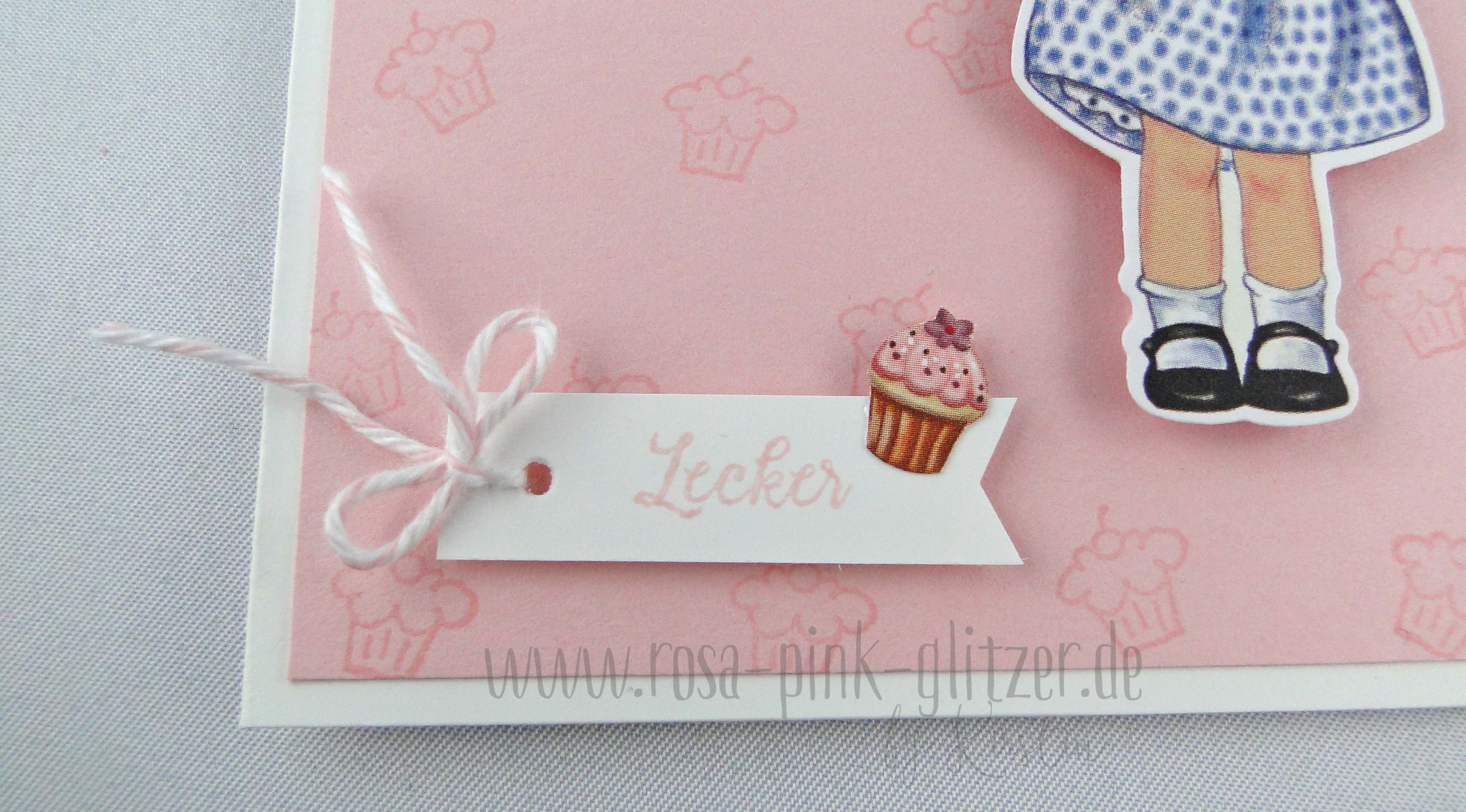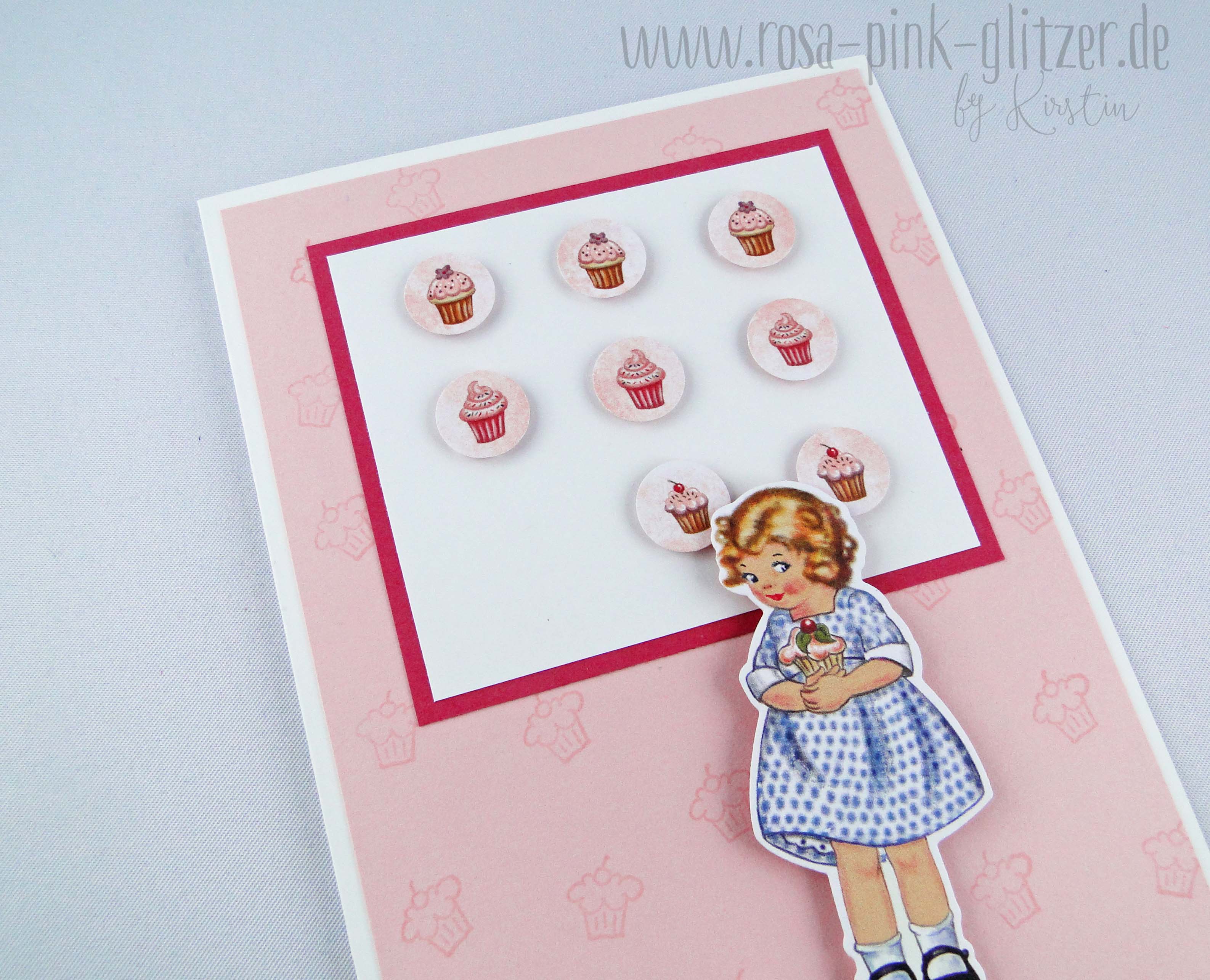 Ich hab eine zuckersüße Karte in rosa für Euch. Das kleine Mädchen und die im wahrsten Sinne des Wortes süßen Cupcakes stammen aus dem Designerpapier „Nostalgischer Geburtstag“, das Ihr im neuen Stampin Up Katalog findet. Das tolle: Es gibt passende Framelits dazu, so dass man einzelne Figuren aus dem Designerpapier nicht mehr mühsam ausschneiden muss sondern einfach nur durch die BigShot kurbelt – fertig.