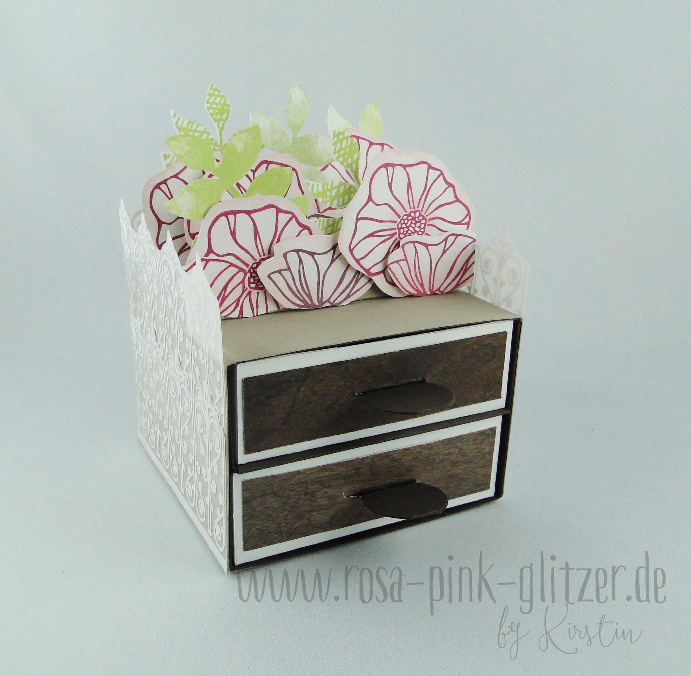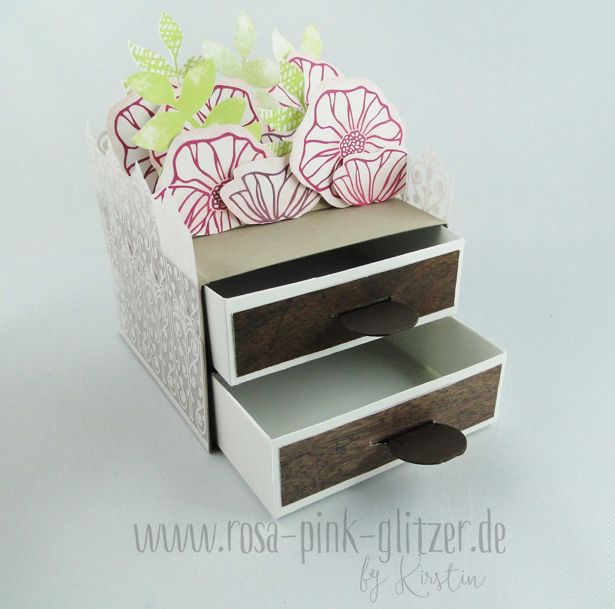 war für eine tolle Inspiration 🙂 Ich hatte mal ganz zu Anfang mal eine Schubladenbox gebastelt. Und jetzt wo ich deine so sehe, bekomme ich wieder Lust 🙂 Mir fehlt nur leider diese Stanze noch. Klasse Idee, diese als Griff zu benutzen. Vielen Dank für deinen Beitrag 🙂