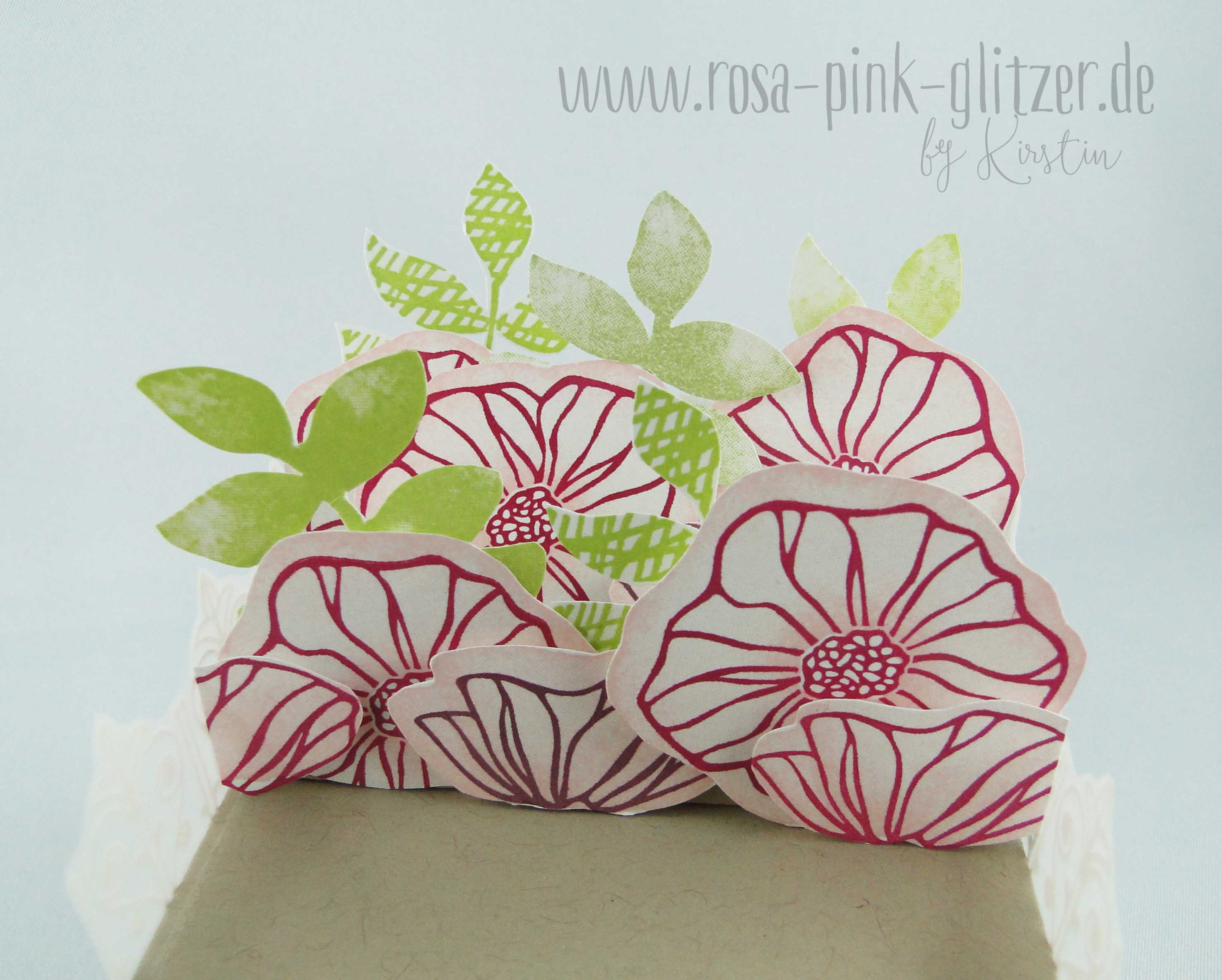 Hier seht Ihr die Blümchen aus dem Stampin up Stempelset Bunt gemischt, die ich gestempelt und ausgeschnitten hab. Kleiner Tipp: Es gibt auch Framelits dazu 😉 Leider hatte ich die nicht in meinem Schauwand-Paket, so durfte die Schneideschere ran.