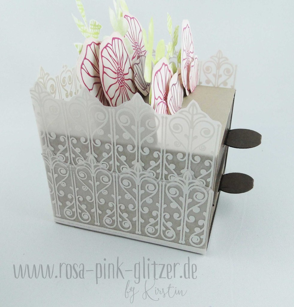Der Rand ist ist mit dem Zaun aus dem Stempelset Segensfeste in weiß auf Velum embosst und dann als Rand geklebt. Erst hatte ich die Idee, einen Mini-Garten zu machen. So ganz ist es mir nicht gelungen aber zumindest wisst Ihr jetzt, wie das alles so kam 😛