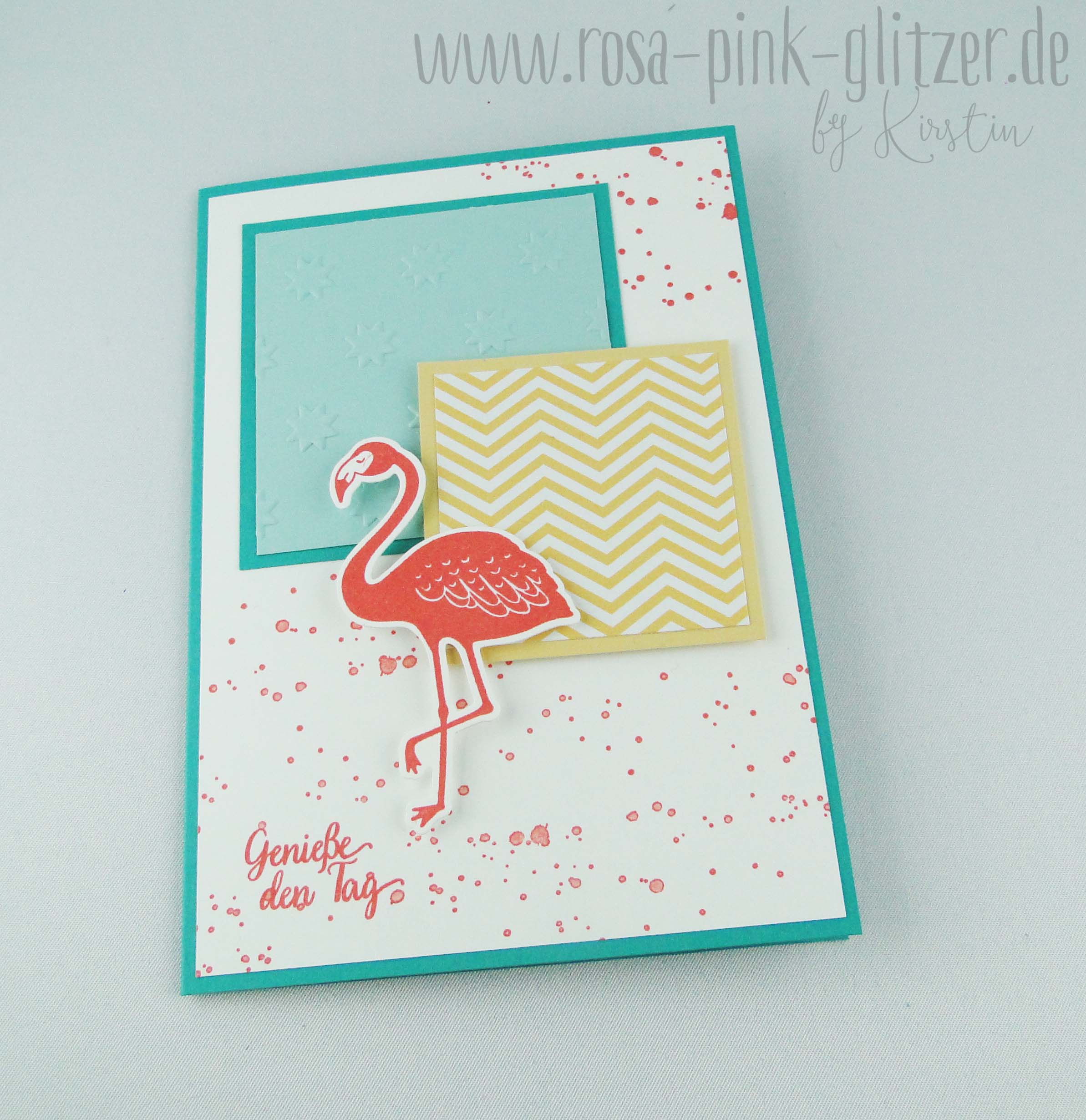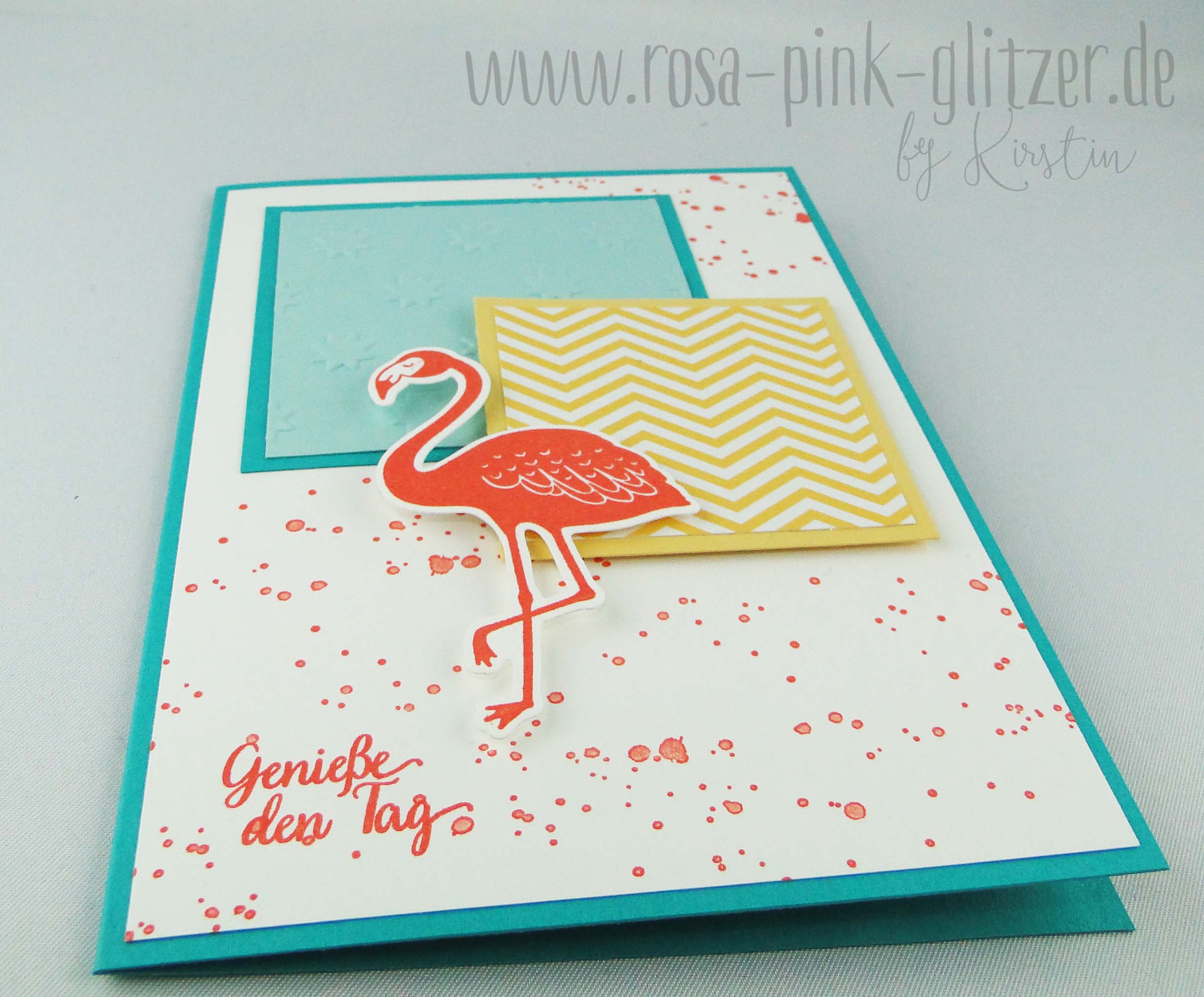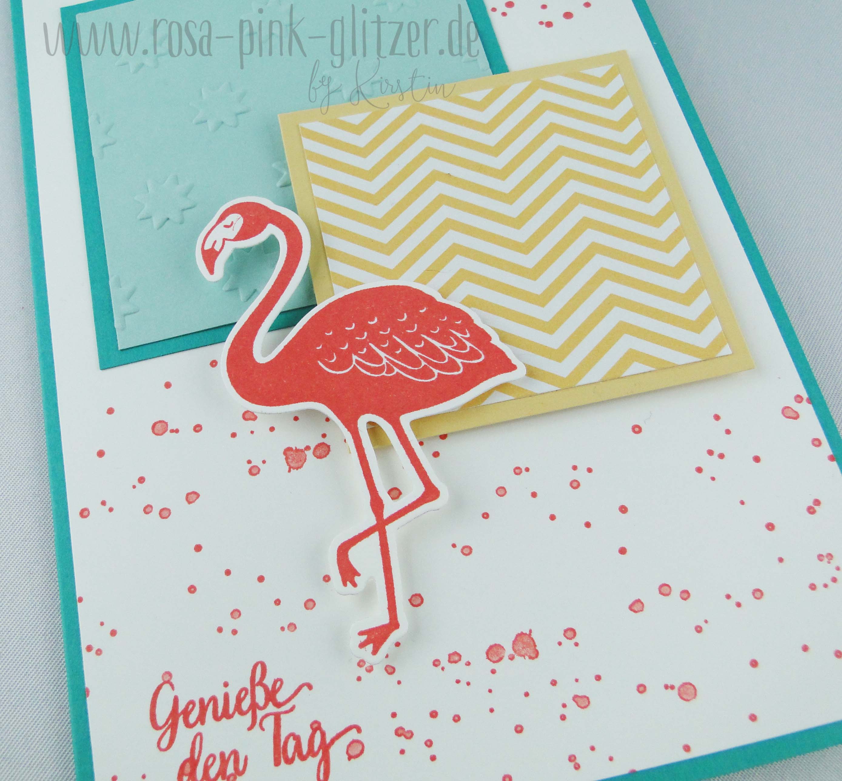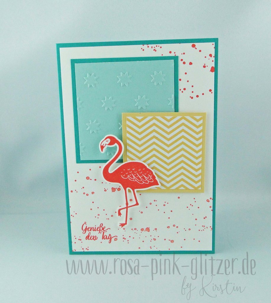 Hier seht Ihr einen einen Prägefolder im Einsatz, den Ihr im neuen Stampin up Katalog findet. Kombiniert hab ich dazu gemustertes Designerpapier in Safrangelb und einen Flamingo in Calypso.