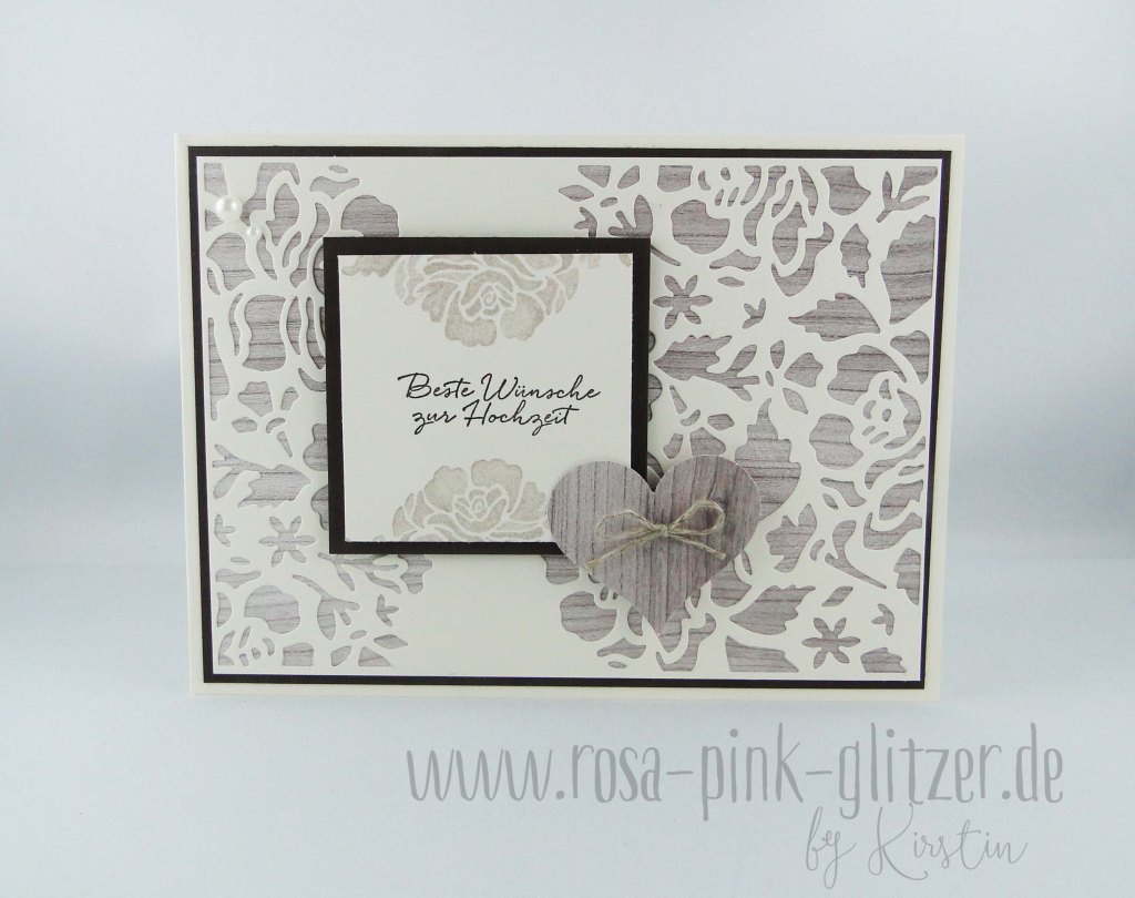 Ich hab damit eine Hochzeitskarte für eine liebe Arbeitskollegin gestaltet. Sie hat auf einem Gut geheiratet, da fand ich die Kombination mit dem Holz-Designerpapier sehr gut. Die Framelits „Florale Fantasie“ von Stampin up bieten sich ja wirklich für Hochzeiten an. Hier und hier habe ich Euch ja bereits auch ganz unterschiedliche Hochzeitskarten damit gezeigt.