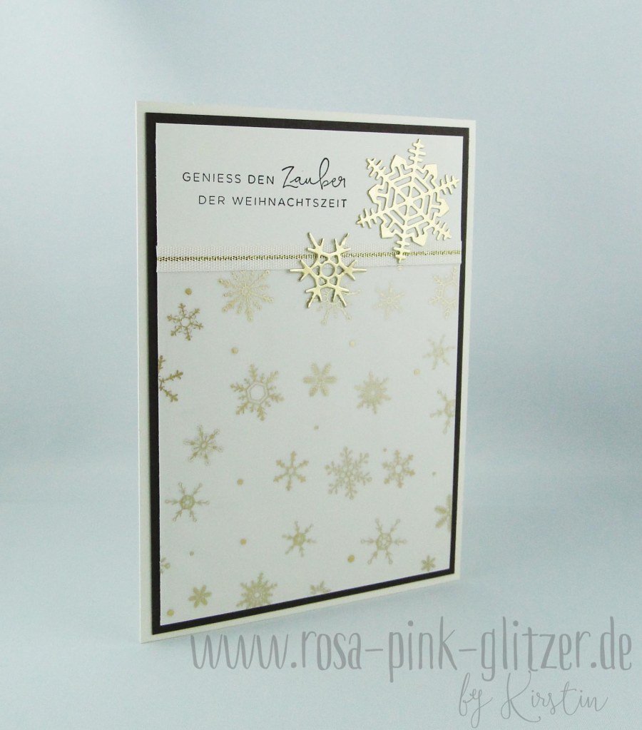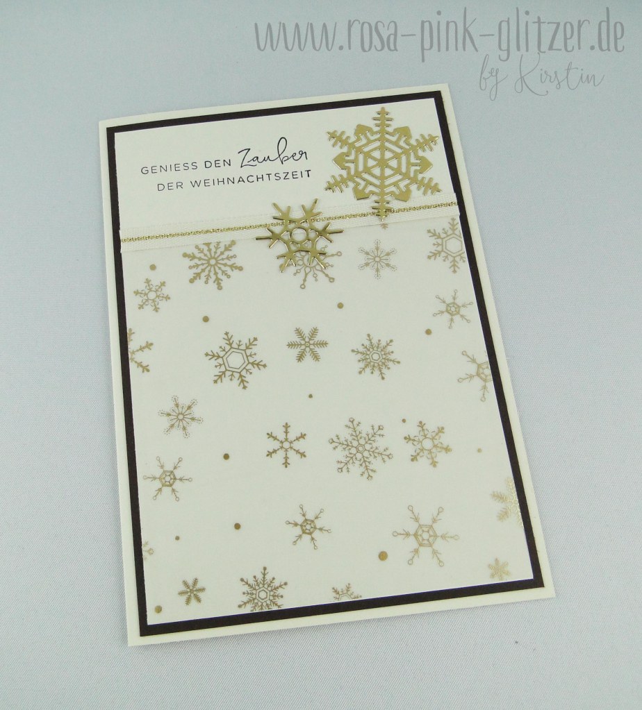 Das Velum mit den hübschen goldenen Schneeflocken stammt noch aus meinem Fundus, der Spruch dagegen ist neu im Herbst-Winter-Katalog von Stampin up zu finden.