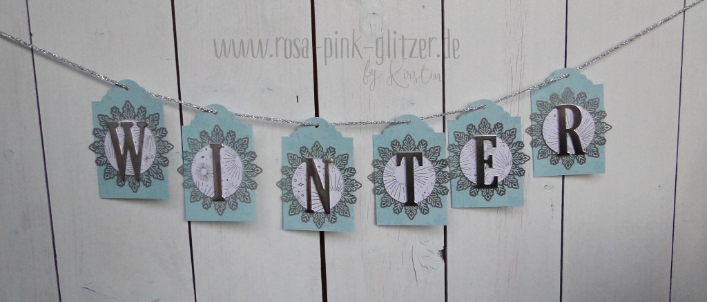 Den Hintergrund der Wimpel hab ich in Himmelblau mit den schönen Schneeflocken aus dem Stempelset „Winterwunder“ von Stampin up gestempelt. Die Glitzergirlande, auf die ich die Fähnchen gefädelt hab, findet Ihr übrigens auf Seite 21 im Herbst-Winter-Katalog von Stampin up.