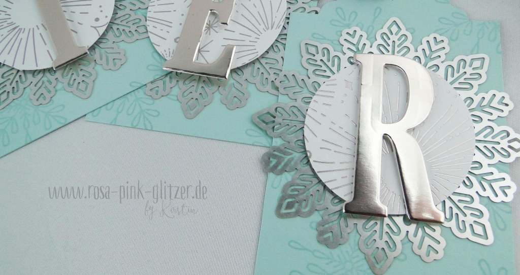 Wie Ihr seht, hab ich dafür die wunderschönen Schneeflocken aus dem Stampin up Herbst-Winter-Katalog zum Einsatz gebracht. Ich gebe zu, ich war sehr skeptisch. Zu groß, zu grell und irgendwie viel zu auffällig. Aber diejenigen, die die schon live gesehen hatten, waren so begeistert davon, dass ich sie mir doch bestellt hab. Und was soll ich sagen – ich liebe sie! Man kann sie so toll kombinieren oder auch nur Teile davon nehmen. Das sind einfach Allrounder! Und im Päckchen sind Silber UND Gold enthalten, man muss ich also nicht entscheiden, welche man (erstmal 😉 ) bestellt. Find ich sehr gut, ich bestelle sehr ungern zwei gleiche Sachen von denen ich nichtmal weiß, ob ich sie mag.