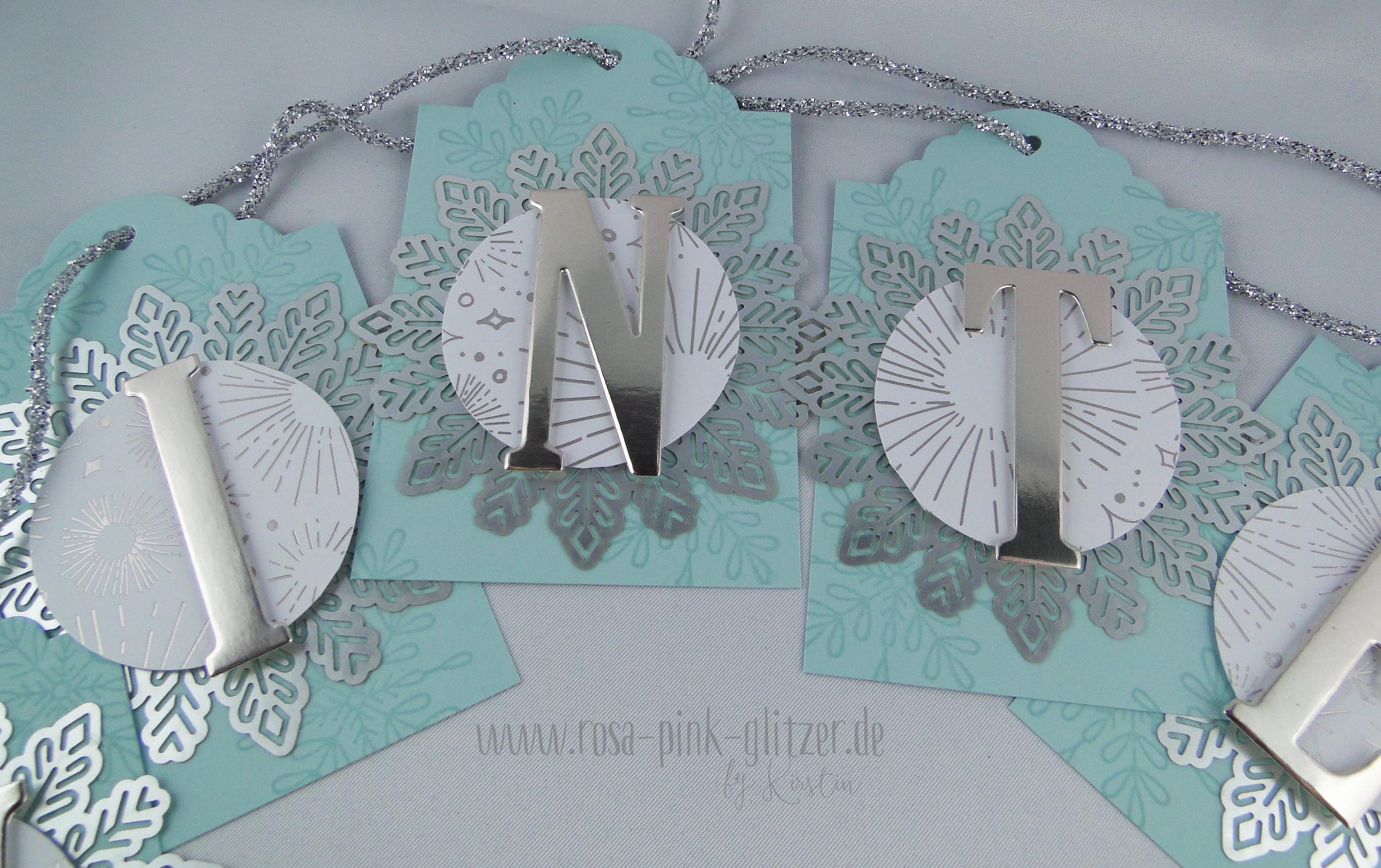 Den Hintergrund der Wimpel hab ich in Himmelblau mit den schönen Schneeflocken aus dem Stempelset „Winterwunder“ von Stampin up gestempelt. Die Glitzergirlande, auf die ich die Fähnchen gefädelt hab, findet Ihr übrigens auf Seite 21 im Herbst-Winter-Katalog von Stampin up.