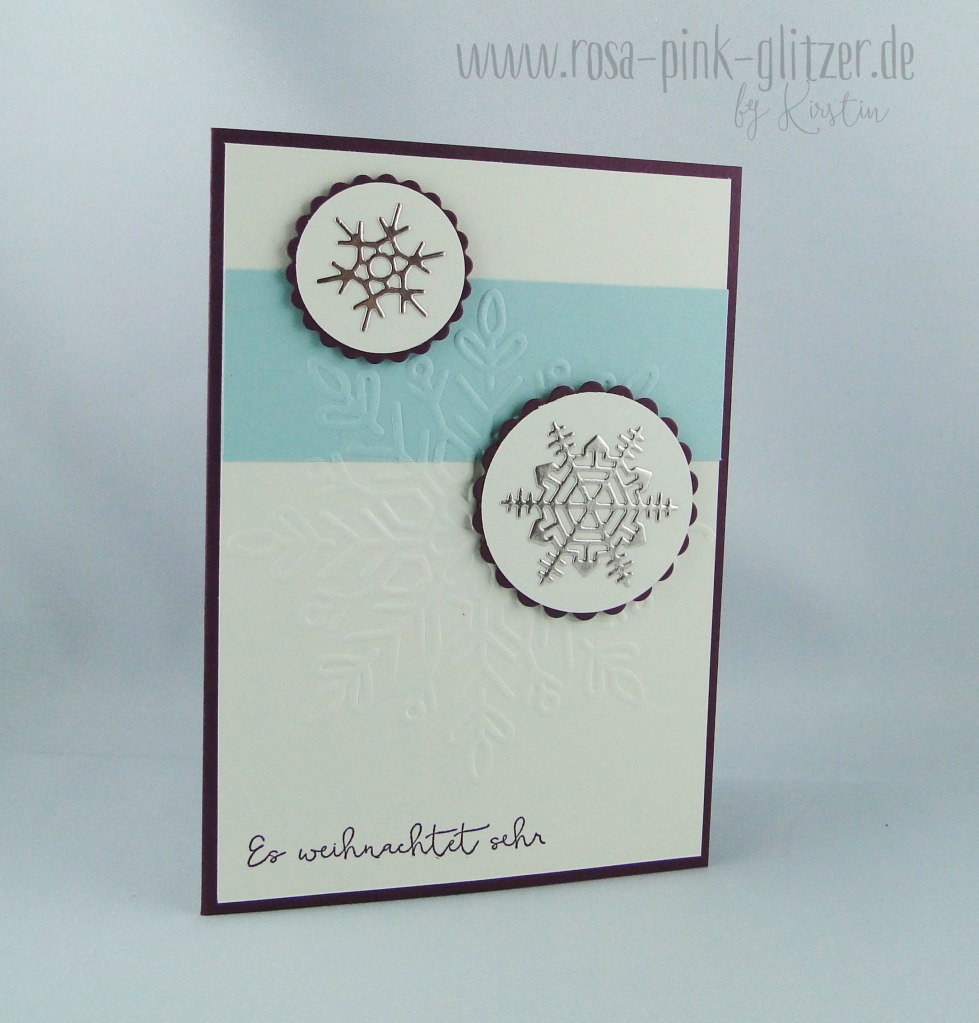 Der Prägefolder mit der großen Schneeflocke ist auch eins meiner Lieblingsprodukte im Katalog. Die Schneeflocke lässt sich allein sehr gut in Szene setzen, macht sich aber auch als Hintergrund sehr gut wie ich finde.