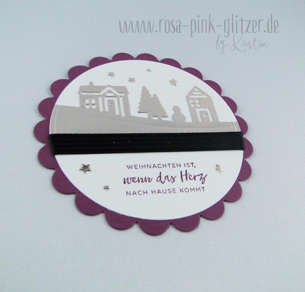 Meine Karte ist mit dem Stempelset „Weihnachten daheim“ sowie den passenden Thinlits „Weihnachtsstädtchen“ gestaltet, beides zu finden im aktuellen Herbst-Winter-Katalog von Stampin up. Das Feige meine diesjährige Weihnachtslieblingsfarbe ist habt Ihr ja vielleicht schon mitbekommen, vor allem in Verbindung mit dem Glanzpapier in Champagner.