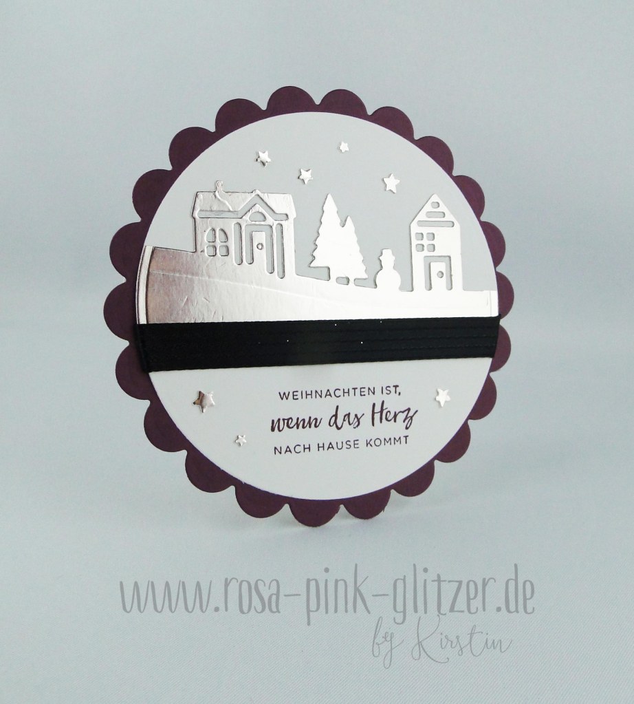 Meine Karte ist mit dem Stempelset „Weihnachten daheim“ sowie den passenden Thinlits „Weihnachtsstädtchen“ gestaltet, beides zu finden im aktuellen Herbst-Winter-Katalog von Stampin up. Das Feige meine diesjährige Weihnachtslieblingsfarbe ist habt Ihr ja vielleicht schon mitbekommen, vor allem in Verbindung mit dem Glanzpapier in Champagner.