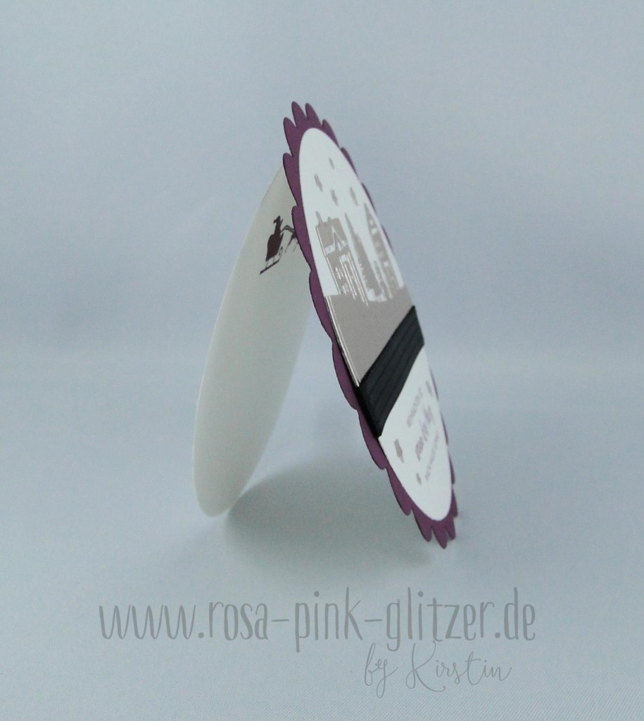 Wie Ihr seht, hab ich das Papier in Flüsterweiß doppelt genommen und das Kreis-Thinlit so angelegt, dass der Falz quasi eine Sekante bildet. So lässt sich die Karte gut aufklappen ohne futzelige Klebereien. Obendrauf wurde dann ein Wellenkreis-Stanzteil in Feige geklebt und darauf dann nochmal ein dekorierter Kreis.