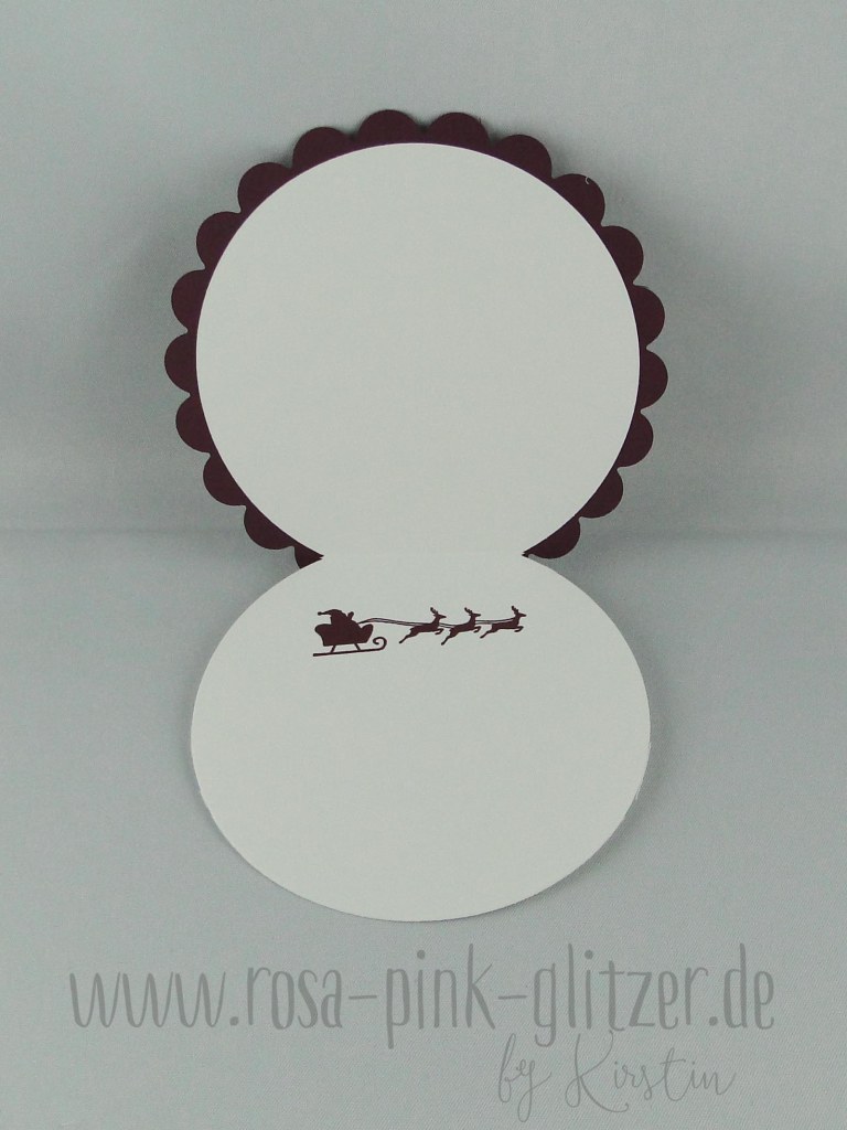 Innen hab ich dann noch den Weihnachtsmann mit seinem Schlitten in Feige gestempelt. Mach ich viel zu selten, dass ich auch innen ein wenig dekoriere. Dabei ist das so hübsch, nicht wahr? Und mit so einem Schlittenmotiv kriegt man mich sowieso total schnell. Ich liebe es!