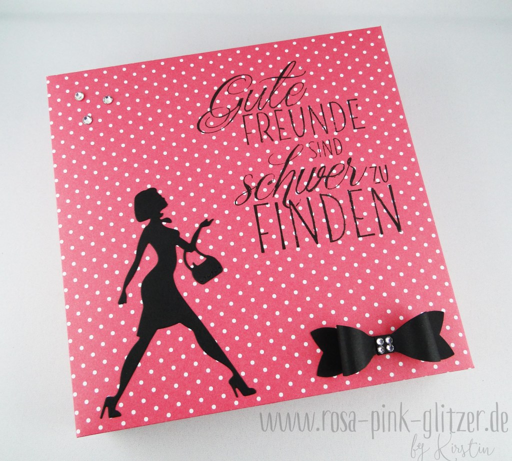 Ich zeig Euch heute ein kleines Geschenk, dass meine liebe Renate bekommen hat. Die Stanzform ist jetzt nicht von Stampin up, passte aber so hervorragend. Wobei ich sie ein wenig „bearbeitet“ hab. Ohne die Hunde wurde daraus nämlich schnell eine Shopping-Queen – passt hervorragend, sowohl zu Renate als auch zu mir.