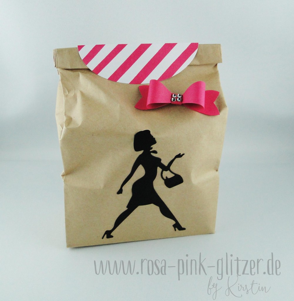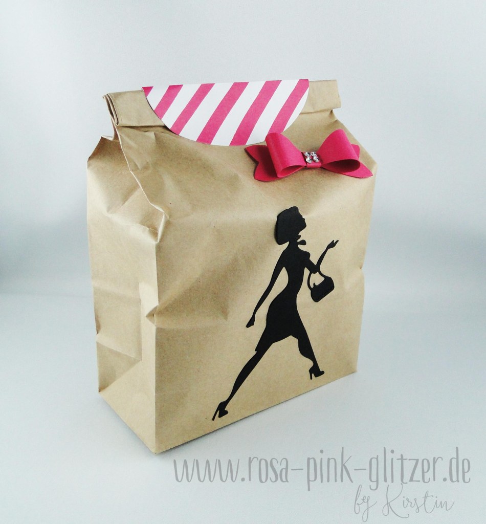 Wie Ihr seht, hab ich wieder das Stanzteil der shoppenden Lady genommen und es mit pink kombiniert. Leider hab ich vergessen, den Inhalt zu fotografieren. Denn drin ist eine Tasse mit passendem Text – SHOPPINGQUEEN! Passt zu mir, zu Renate und das Geschenk passt auch dazu.