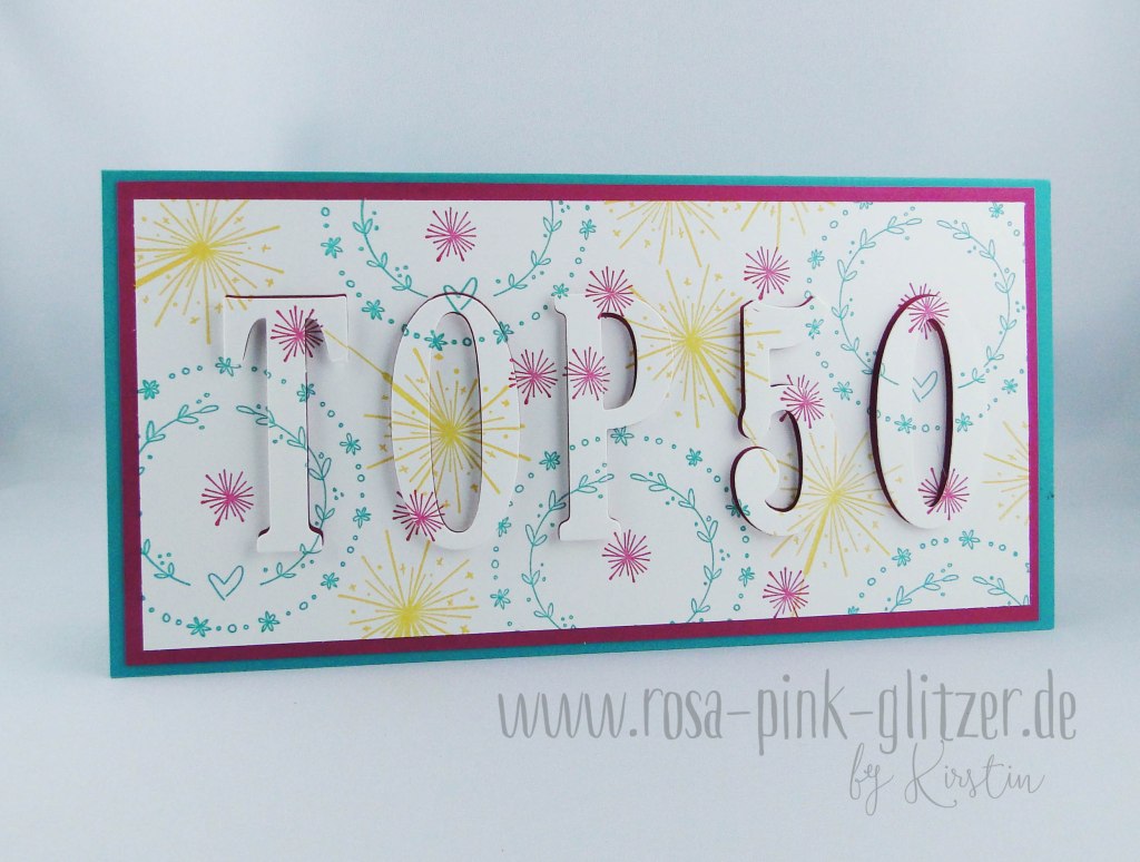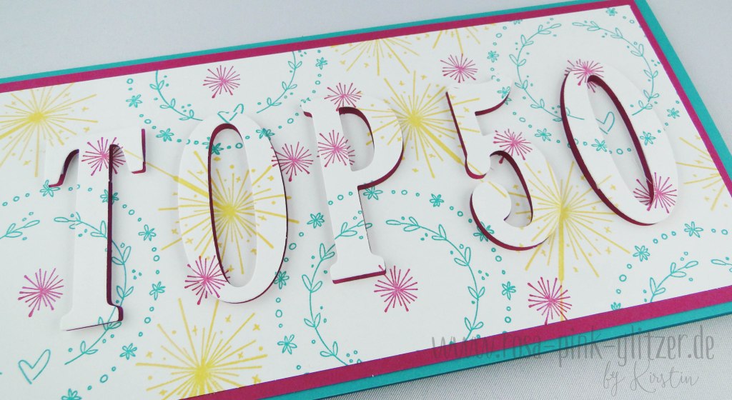 Zuerst habe ich mir quasi mein eigenes DSP gestempelt und dann den Text ausgestanzt. Gut, dass Buchstaben und Zahlen so gut zusammenpassen 😉 Anschließend hab ich die 3 Lagen Cardstock (Bermudablau, Sommerbeere, gestempeltes Flüsterweiß) zusammengeklebt. Die Buchstaben werden dabei mit 3-D-Kleber geklebt. Nur die kleinen Innenteile beim O und P und bei der 0 werden „normal“ ohne Abstandskleber aufgeklebt. Dadurch scheint der Untergrund – beim mir Sommerbeere – ein wenig durch und es ergibt sich ein schöner Effekt.