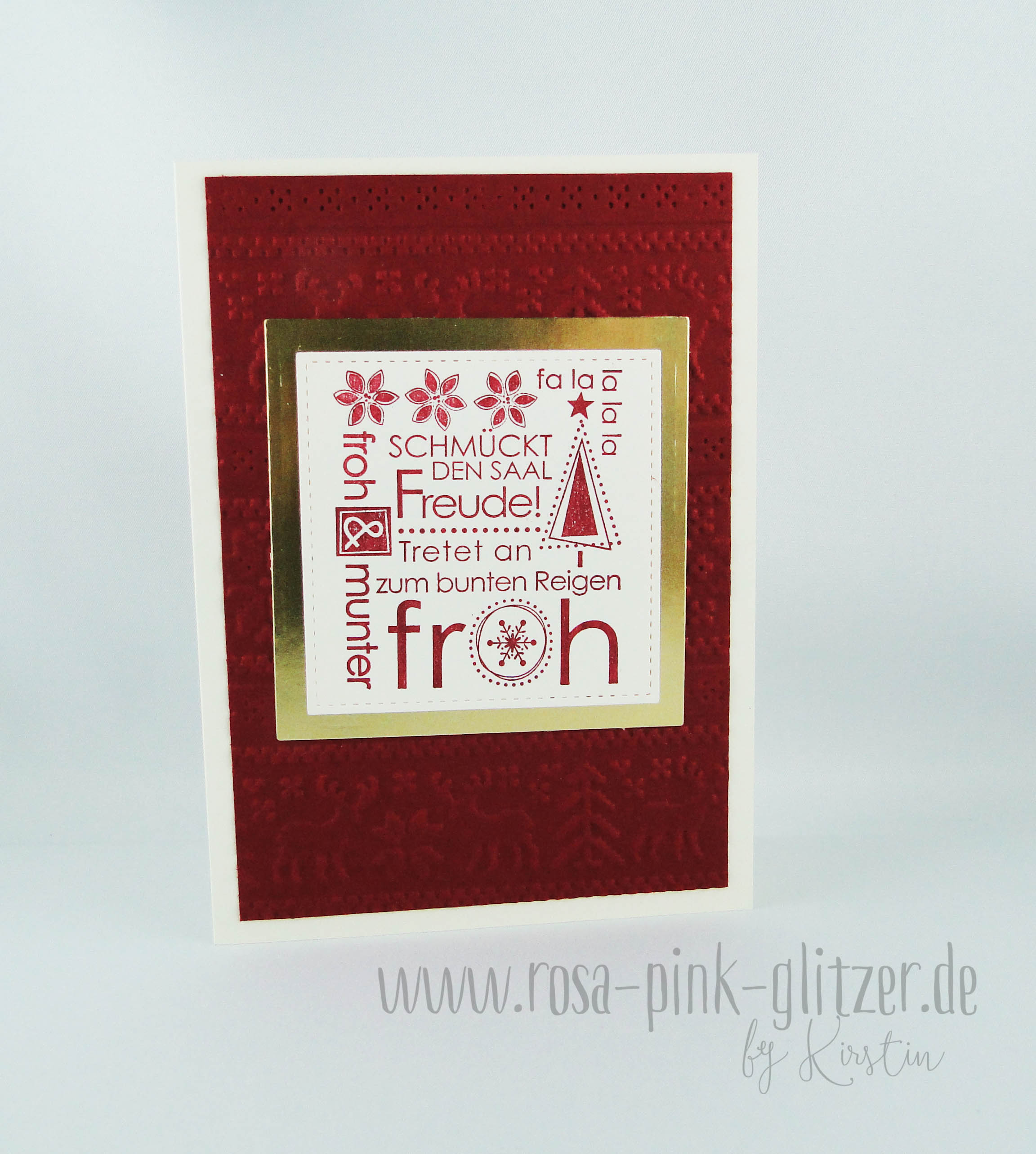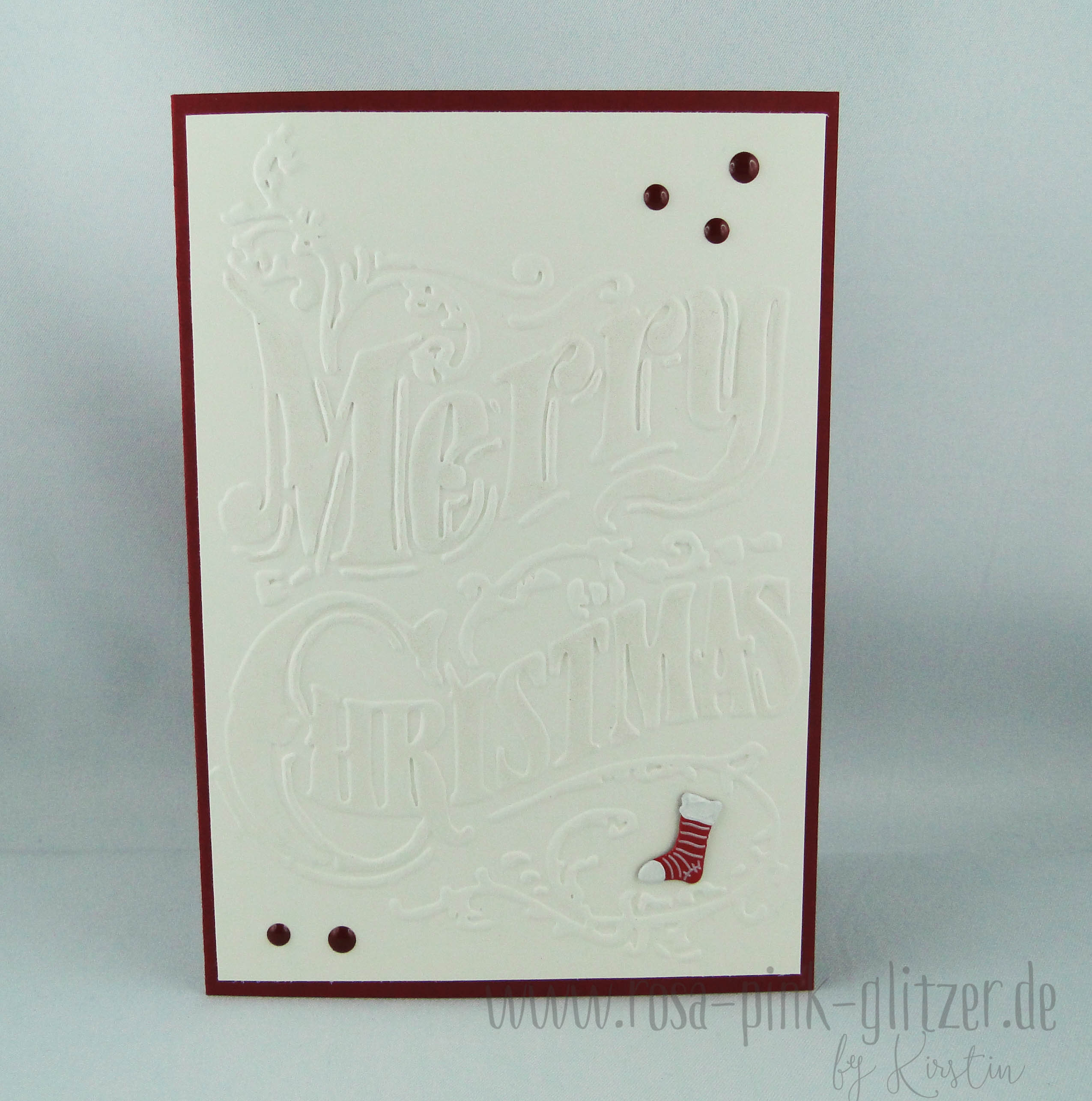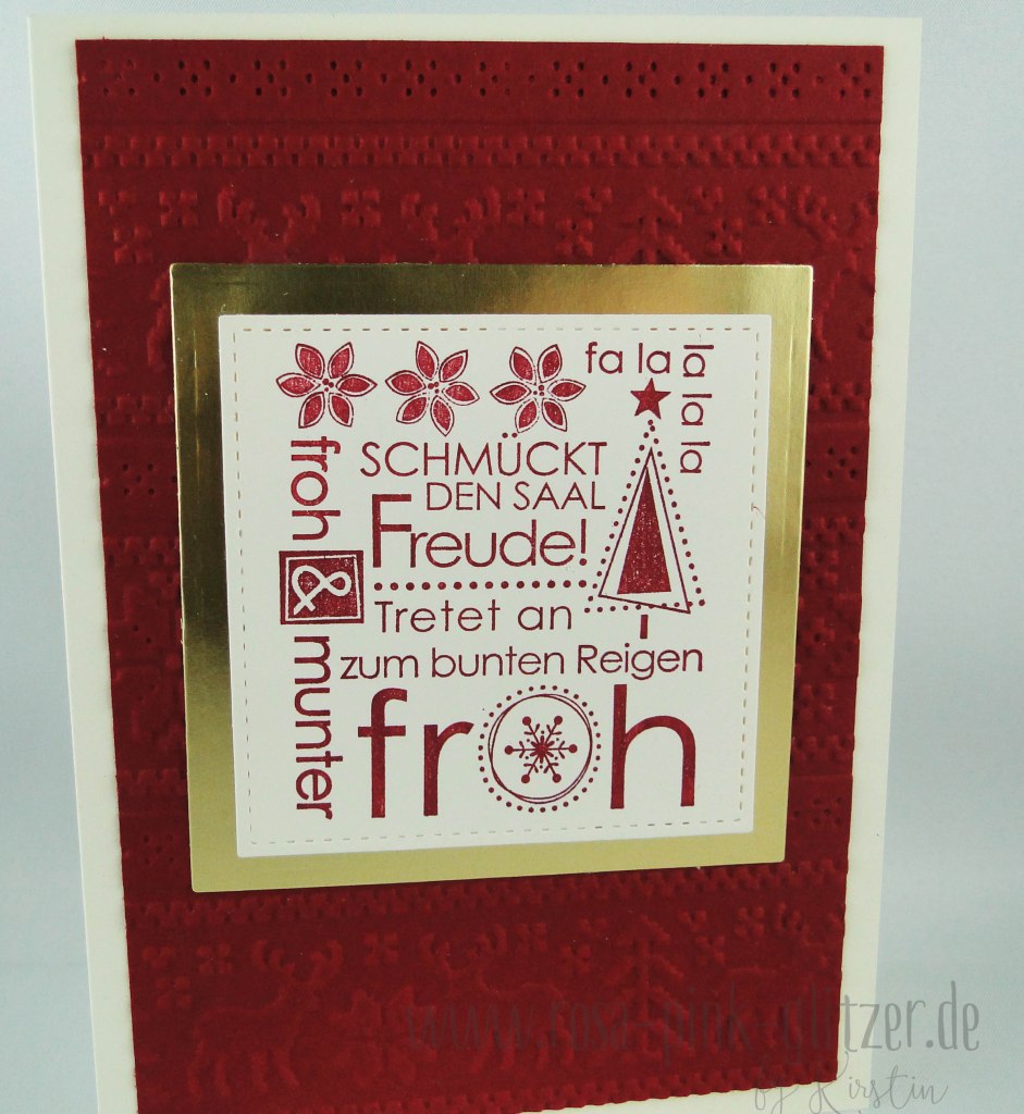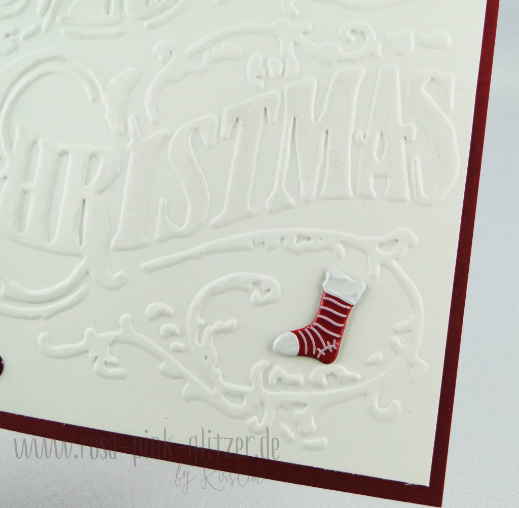 Die zweite Karte ist großflächig mit einem „Merry Christmas“-Prägefolder geprägt. Ich fand den so toll und musste ihn unbedingt haben.