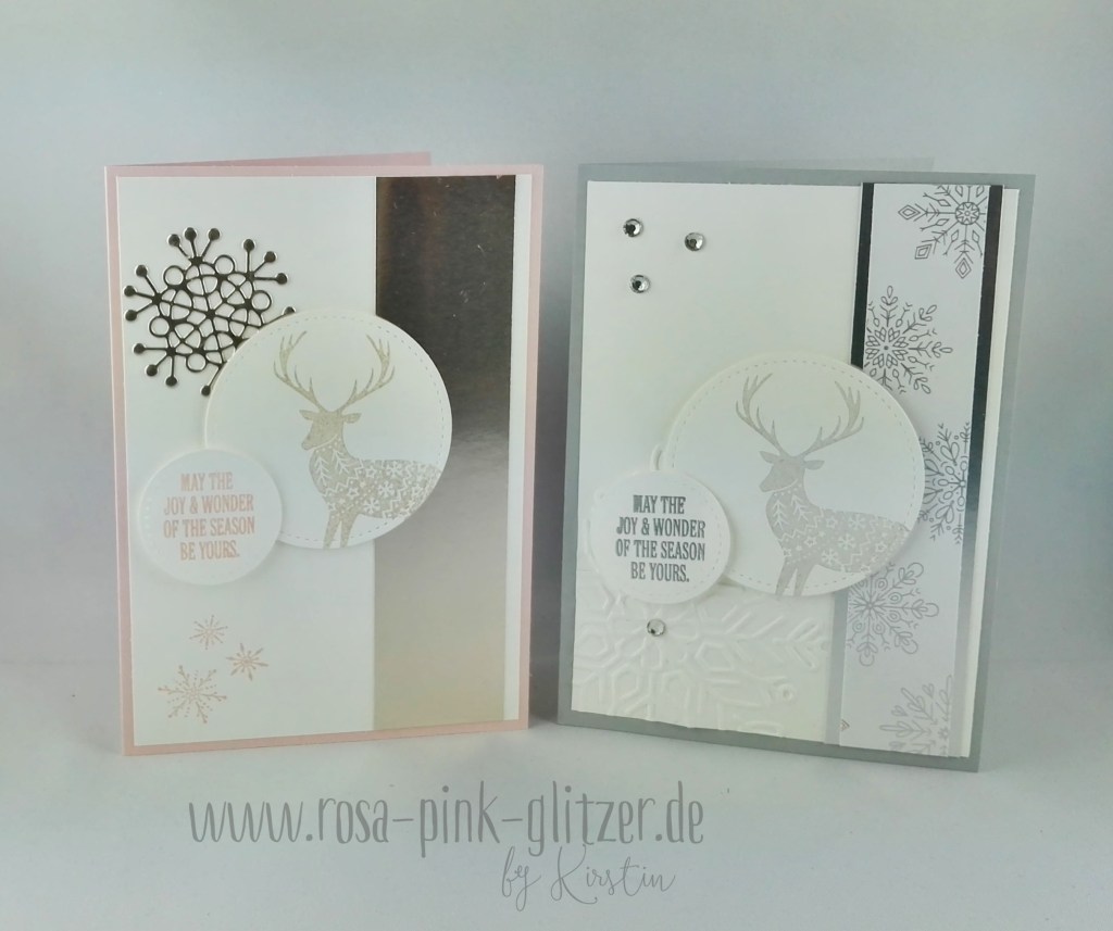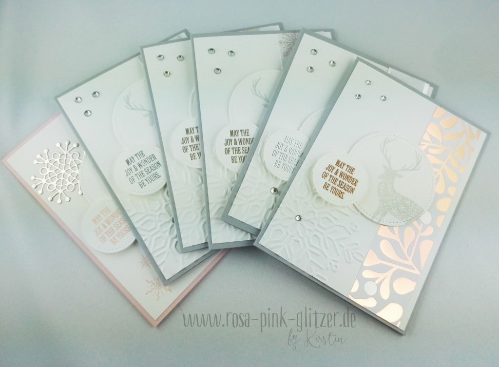 So hab ich heute ein Kartenset für Euch. Ich hab dafür das wunderschöne, glänzende Designerpapier aus dem Stampin up Herbst-Winter-Katalog genutzt und den Hirsch aus dem Stempelset „Freude im Advent“. Ich komme einfach nicht von ihm los 😉
