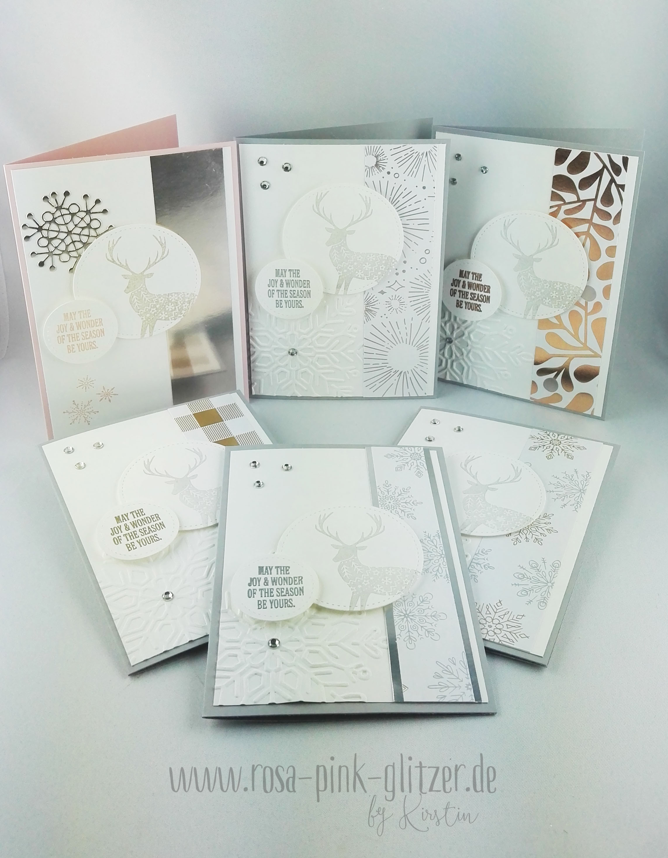 So hab ich heute ein Kartenset für Euch. Ich hab dafür das wunderschöne, glänzende Designerpapier aus dem Stampin up Herbst-Winter-Katalog genutzt und den Hirsch aus dem Stempelset „Freude im Advent“. Ich komme einfach nicht von ihm los 😉