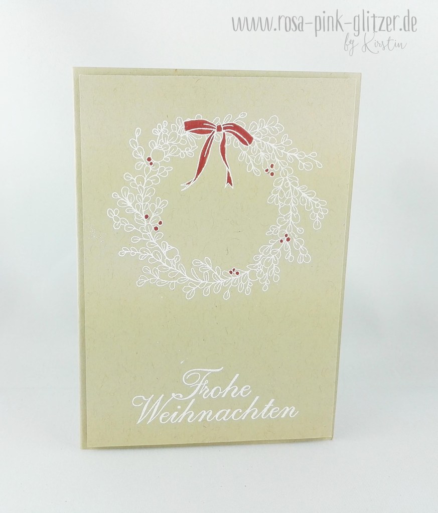 Diese hier ist der ersten sehr ähnlich nur dass statt Cardstock in Schiefergrau auf Glutrot zurückgegriffen wurde.Die letzte Karte unterscheidet sich ein wenig von den anderen. Hier hab ich als Basis Savanne genutzt und darauf in weiß embosst. Irgendwie krieg ich das Embossing bei dieser Farbgebung leider nicht auf dem Foto eingefangen. Ich muss sagen, dass mir diese Kombination neben dem Original am besten gefällt.