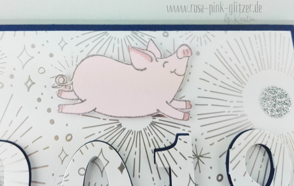 Die Schweinchen sind in Silber auf Cardstock in Zartrosa embosst. Zusätzlich hab ich mit den Stampin Blends Akzente gesetzt.