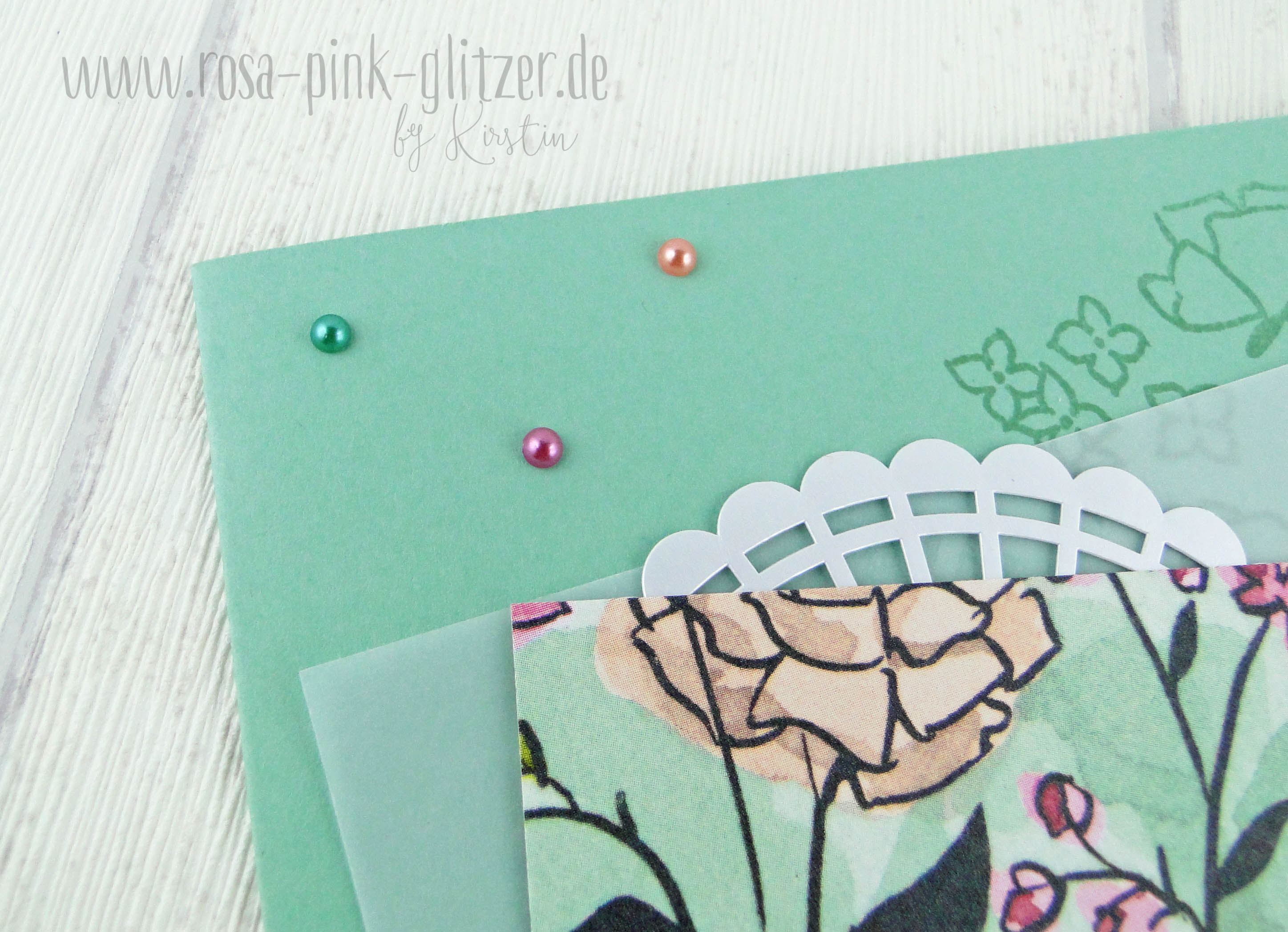 Diese kleinen Schätzchen mit feinem Perlmuttglanz passen perfekt zur Karte. Auch die werdet Ihr im neuen Stampin up Katalog finden.