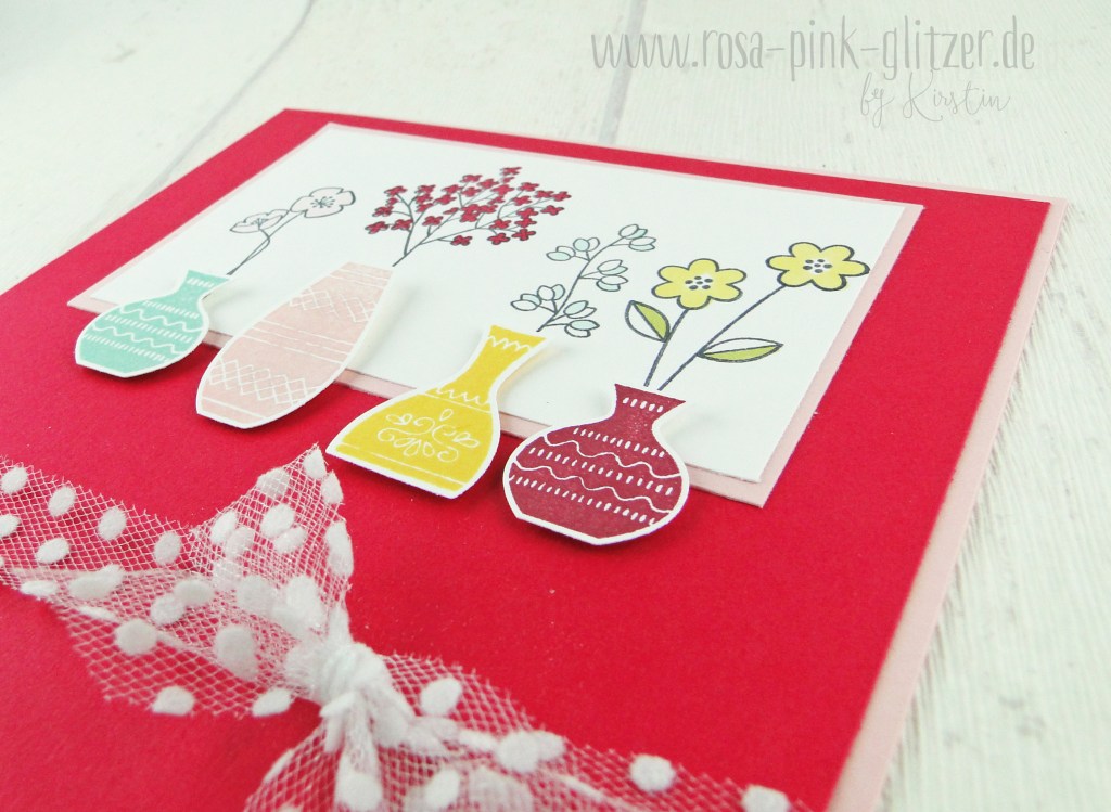 Ich hab – mal wieder – zum Stempelset „Wunderbare Vasen“ gegriffen. Das Set ist einfach so toll 😀 Hier seht Ihr nun auch mal mehr als ein Blümchen und eine Vase im Einsatz. Die machen sich auch im Rudel ziemlich gut 😉