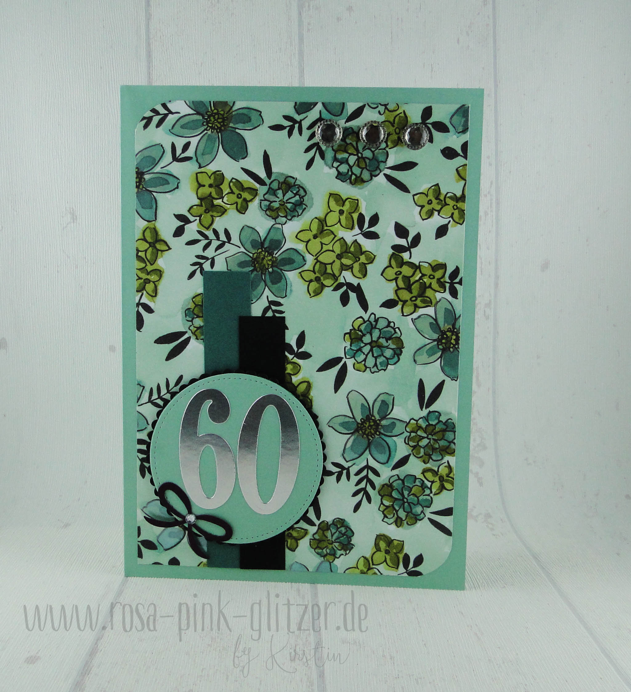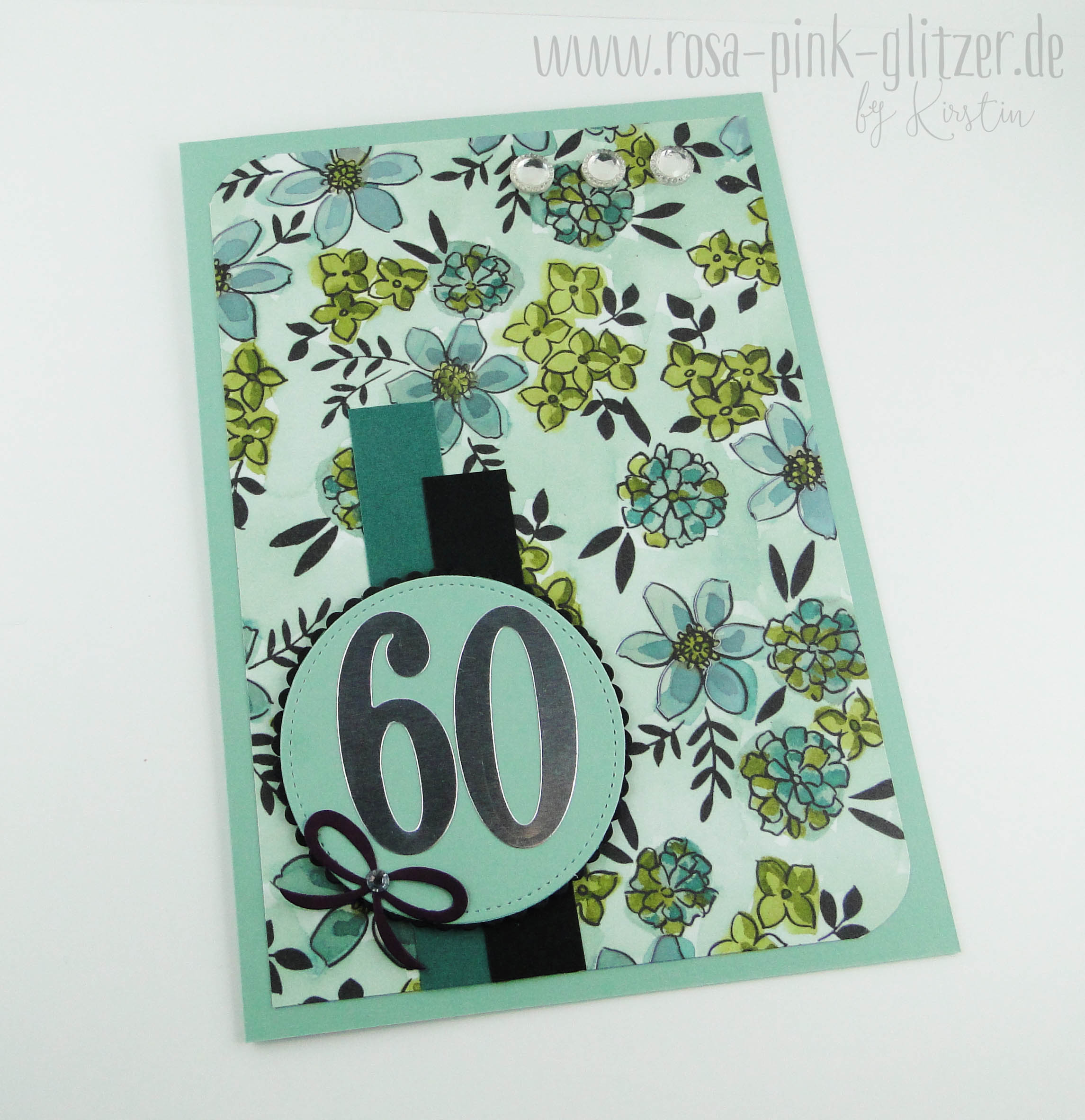 Unschwer zu erkennen ist die Karte zum 60. Geburtstag. Die Zahlen in Champagner passen so schön zum feinen Glanz des Designerpapiers. Die Karte ist übrigens in DIN A 5, weil mehrere Leute liebe Grüße darauf hinterlassen sollten.