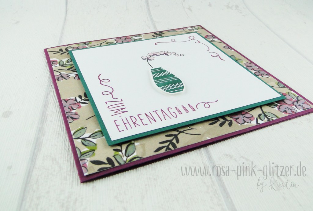 Durch verschiedene Ebenen wird die Karte doch gleich nochmal interessanter. Die Farben sind übrigens neben Flüsterweiß noch Himbeerrot und Meergrün – passend zum Designerpapier.