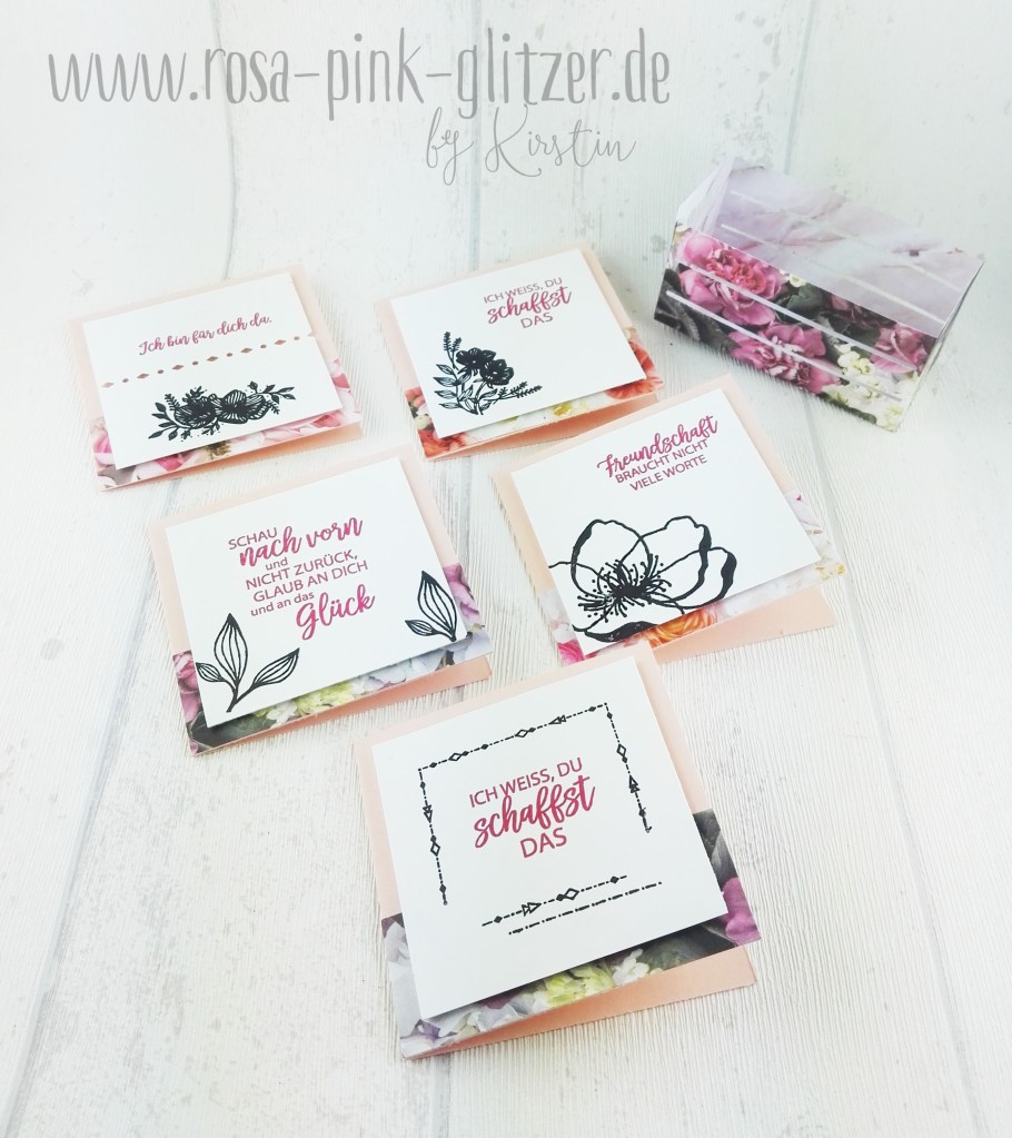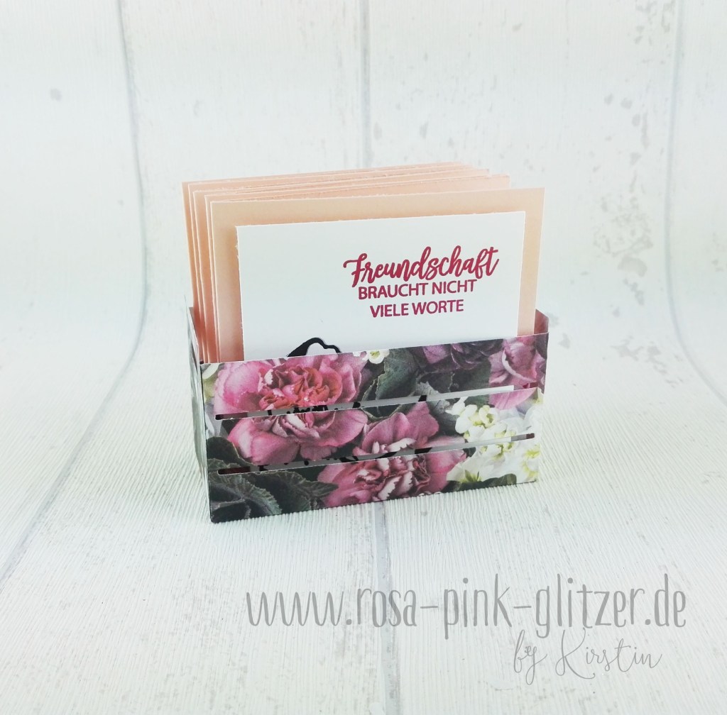 Ich hab kleine Mini-Kärtchen für Euch, die ihren Platz in einem kleinen Blütenkistchen finden. Ich hab dafür zum Designerpapier Blütenpracht gegriffen. Achtung, das ist wirklich sehr blütenlastig und romantisch. Aber auch sooo schön! Kombiniert habe ich es mit dem Stempelset Blütenzauber.