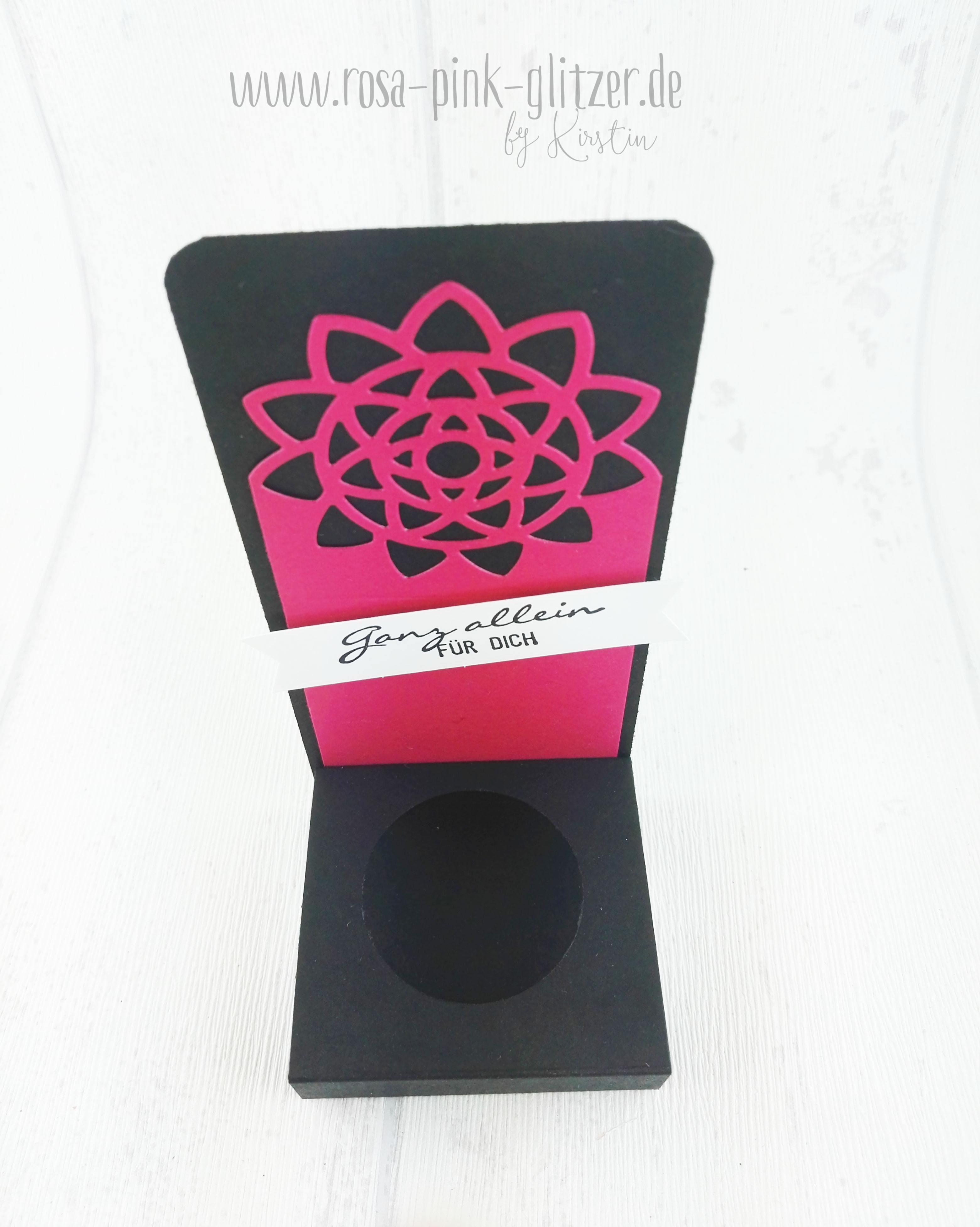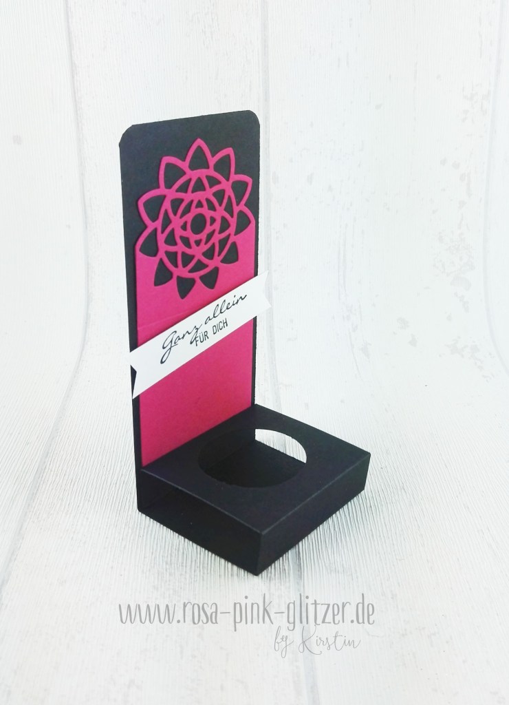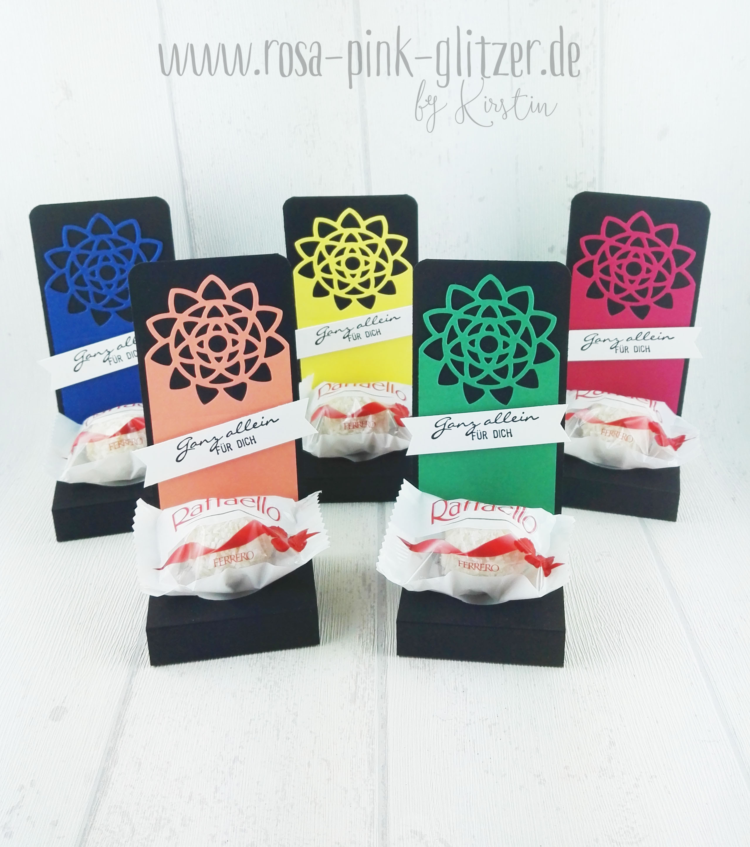 Ich hab kleine Schenklis gebastelt, die sich auch super für Tischkärtchen eignen. Das wunderschöne Ornament ist aus dem Thinlits-Set Zauberhafte Anhänger, das zum Stempelset Gartenzauber passt. Aus letzterem stammt auch der hübsche Spruchstempel.