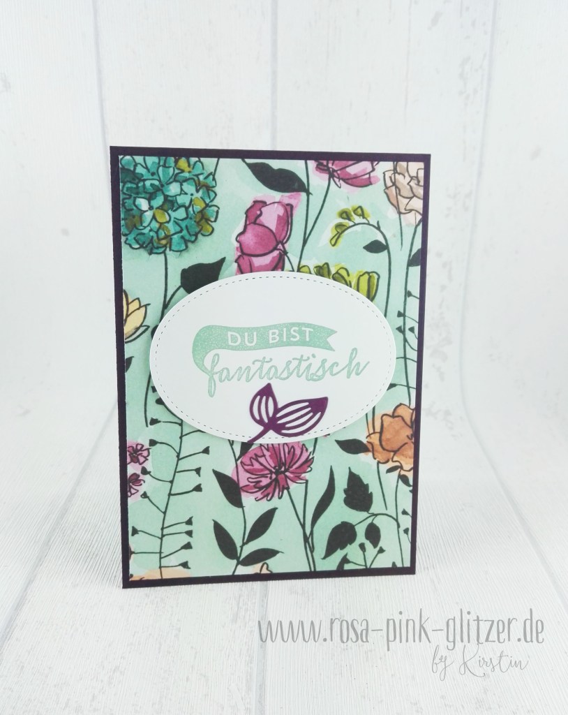 Die beiden Schriftzüge stammen aus dem Shopping-Vorteils-Stempelset Frühlingsspaziergang aus dem neuen Stampin up Hauptkatalog. Und die schönen Schnörkel, neudeutsch auch Doodle genannt, stammen aus dem Stempelset „Um die Ecke“.