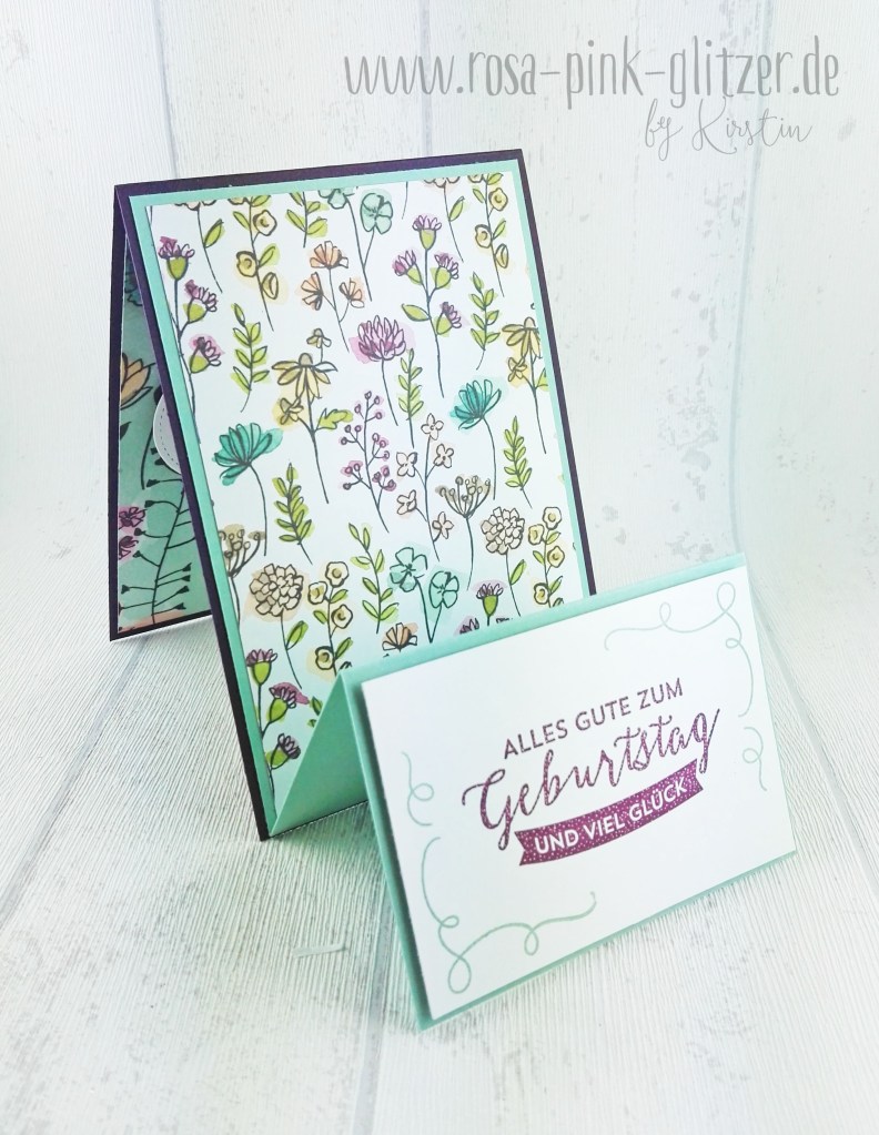 Jetzt aber zu meinem Werk. Ich habe eine Kartenform für Euch, die Easelcard und Treppenkarte vereint. Hat mir gut gefallen muss ich sagen. Bei der Treppenkarte störte mich immer ein wenig, dass man erstens irgendwie nicht gut Text unterbringt und dass sie zum verschicken irgendwie doof war. Gut, ich hatte bisher auch nur eine Side-Step-Karte gemacht (ich verlink Euch mal die Anleitung, vielleicht hilft sie dem ein oder anderen ja).