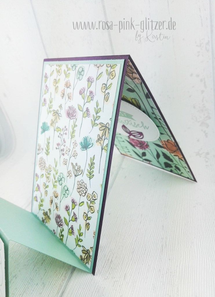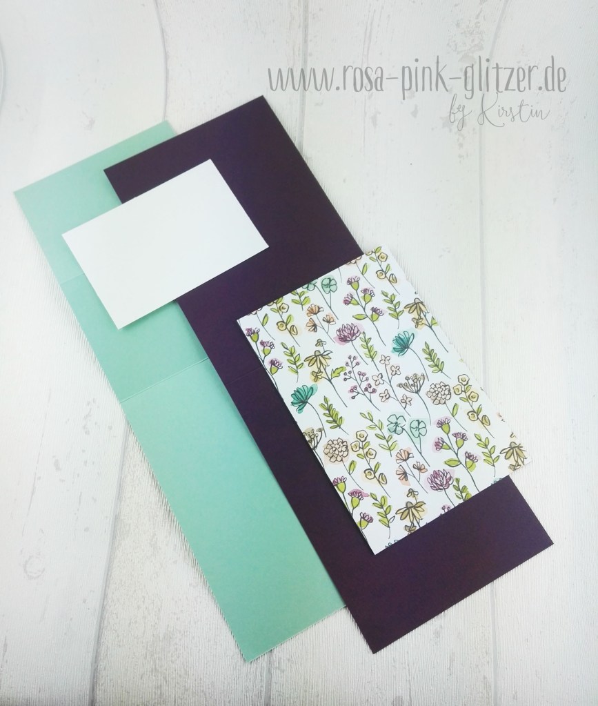Dann Designerpapier und Label aufkleben, die Vorderseite dekorieren und fertig ist das Werk. Ich wünsch Euch viel Spaß beim Nachbasteln! Die Idee hab ich kürzlich übrigens auch bei Patty Bennet gesehen, die diese Kartenform auch wunderhübsch umgesetzt hat.